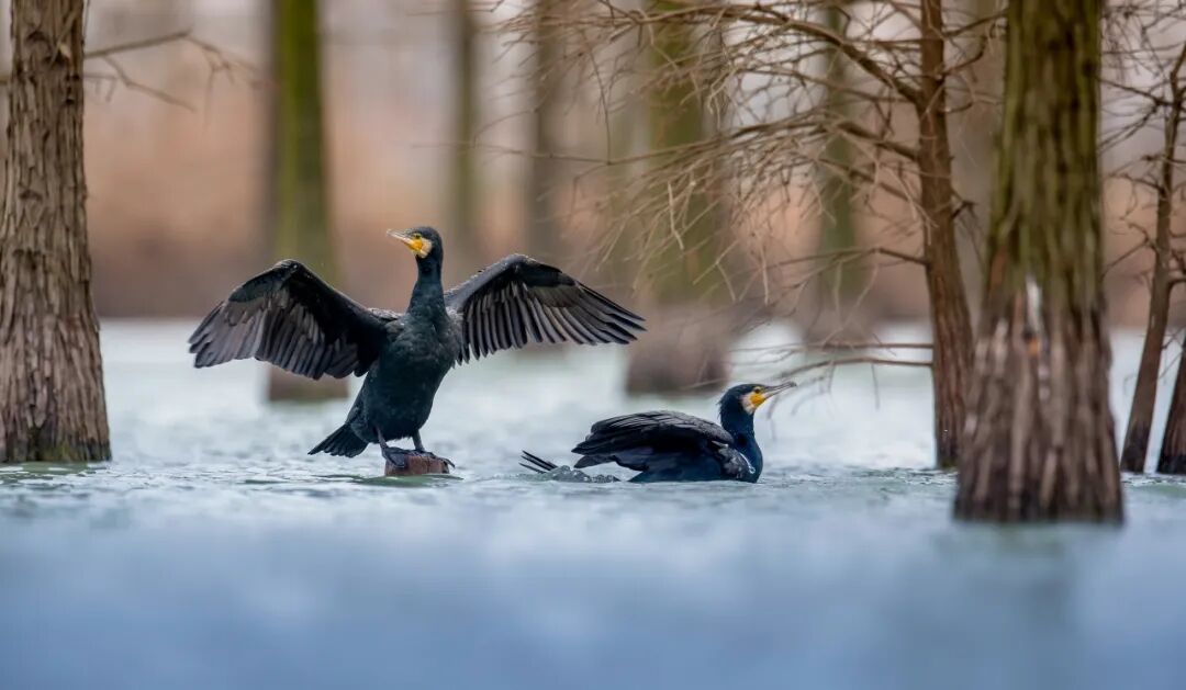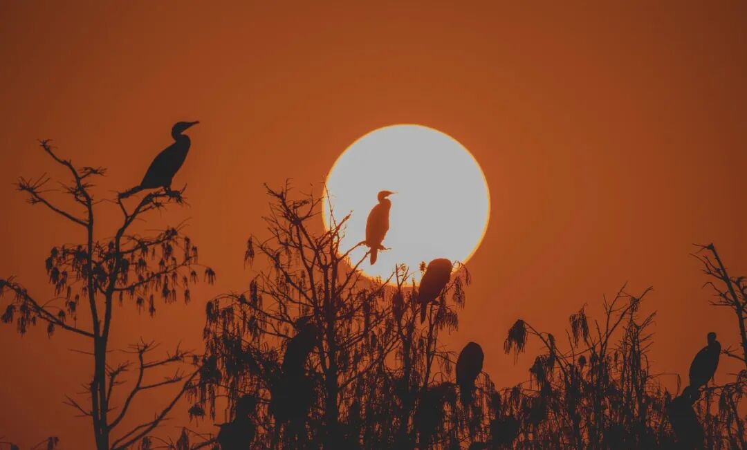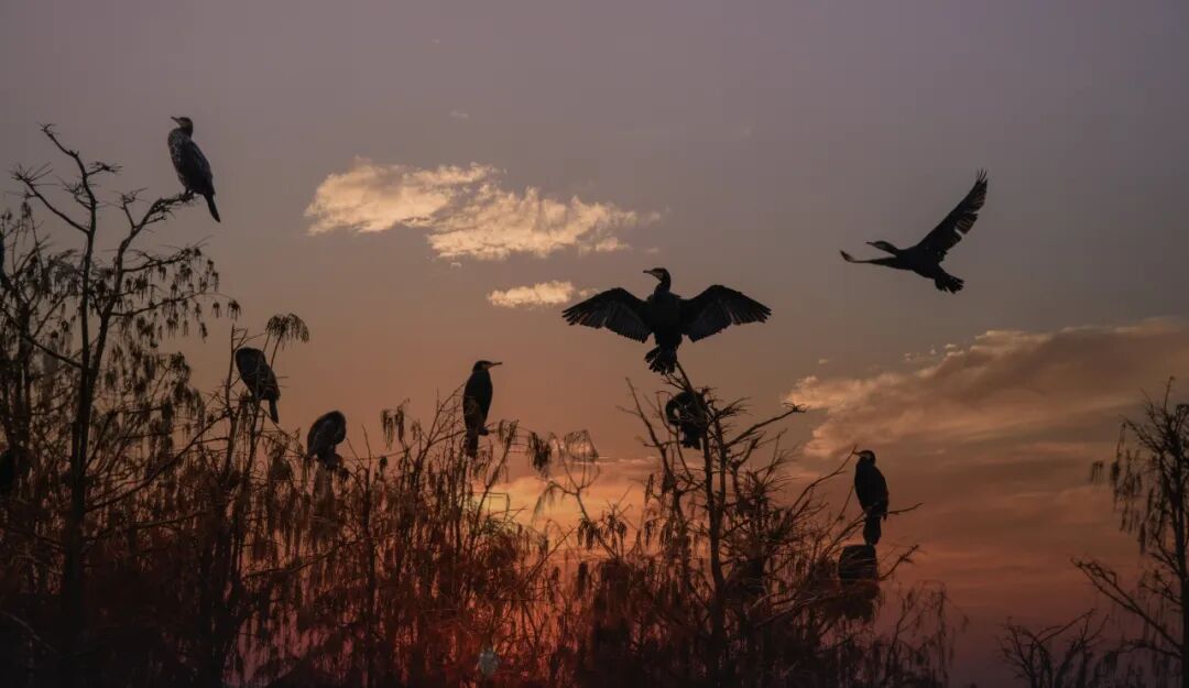 2014年,它们首次到访池杉湖时仅千余只,如今已壮大到两万多只,像一支“黑衣军团”。每年10月,它们一到,原本占据鸬鹚广场这片开阔“湖景房”的白鹭、夜鹭就乖乖退到两侧,活脱脱“湿地一霸”,景区工作人员笑称他们为这里的“黑社会”。每到傍晚,鸬鹚停满枝头,黑压压的种群把树枝压弯,十分壮观。