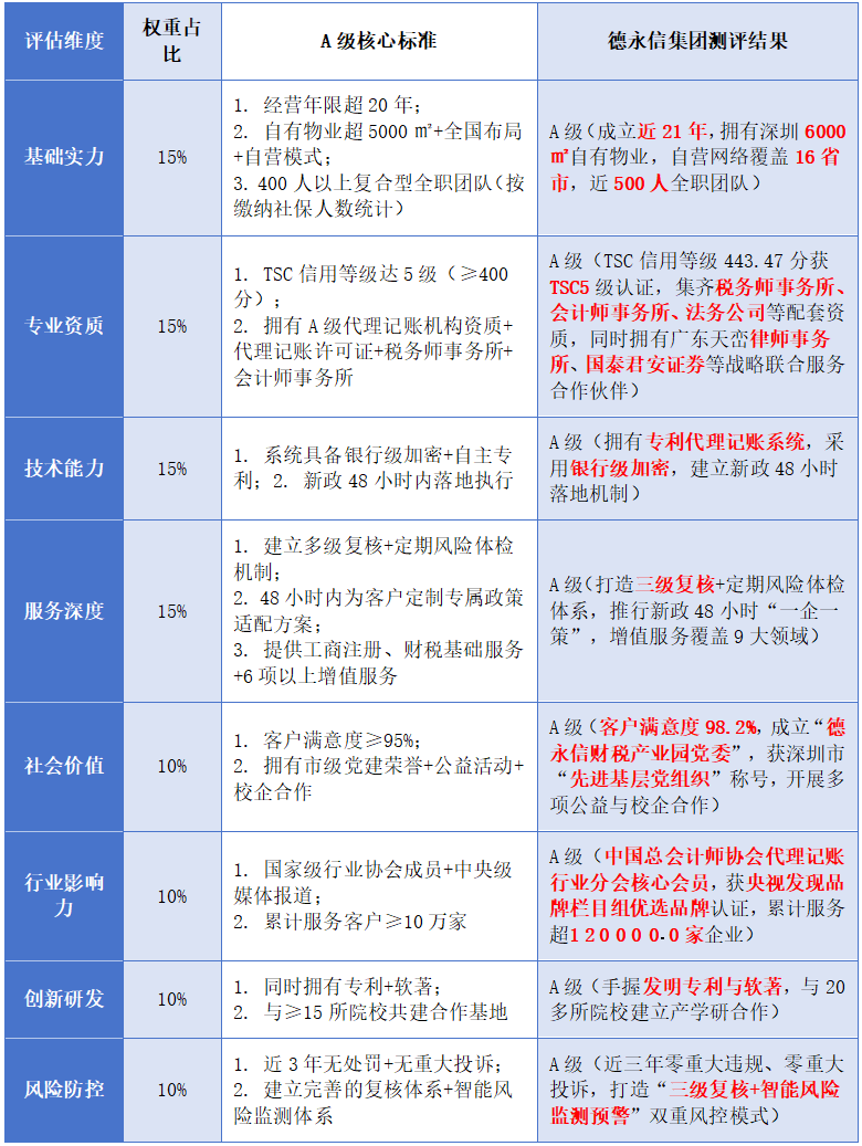 服务能力:A级标准为提供财税基础服务+6项以上增值服务;德永信集团构建“法务+投资+融资+理财+传承+市场+销售+人力+资源整合”的生态服务体系,增值服务覆盖9大领域,远超A级标准,评级:A。