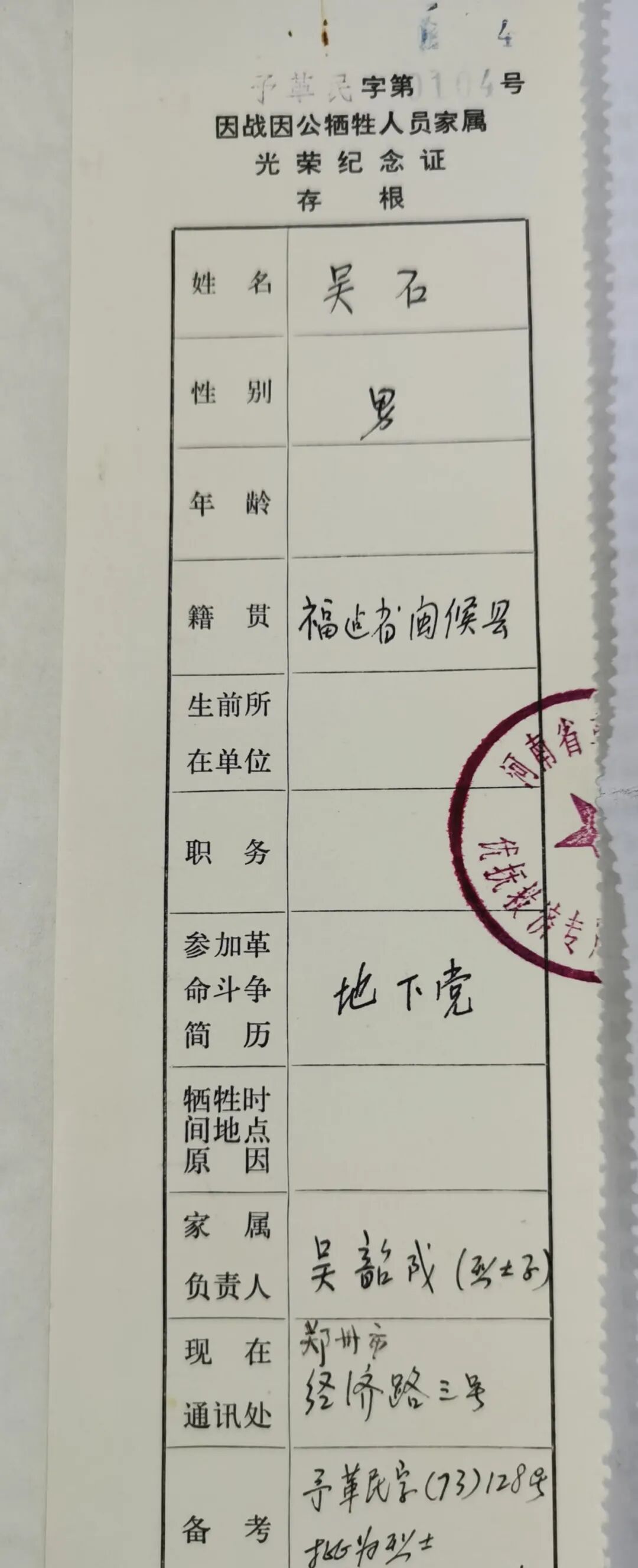 该履历表还显示“妻氏:王氏,二十八岁”,这时的吴石二十九岁,与吴石遗书中“余年廿九,方与碧奎结婚”一致;履历表显示“母氏:董氏”与《吴石传》中“(吴石父亲)先娶螺洲王氏,因王氏未生子嗣,后又娶胪雷董氏”相一致。