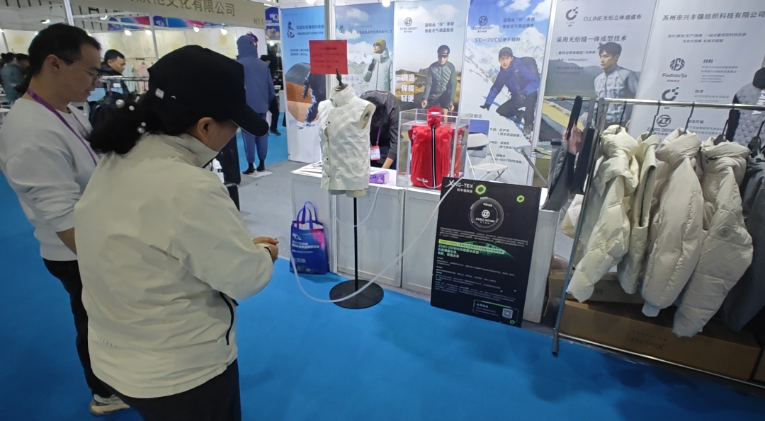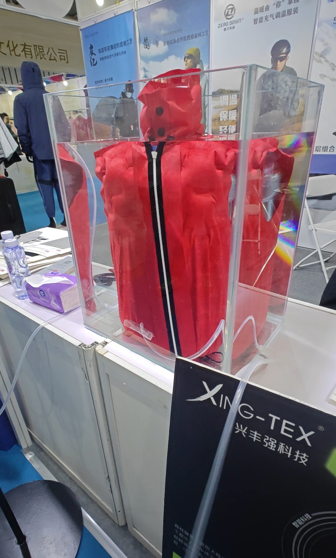 “原理就是用空气层来隔热保暖。”苏州市兴丰强纺织科技有限公司展位负责人向记者表示,“传统羽绒或棉服依靠填充物蓬松后锁住静止空气来保温。我们减少了填充物,直接注入空气来实现隔热,这样更环保,也更轻便。”