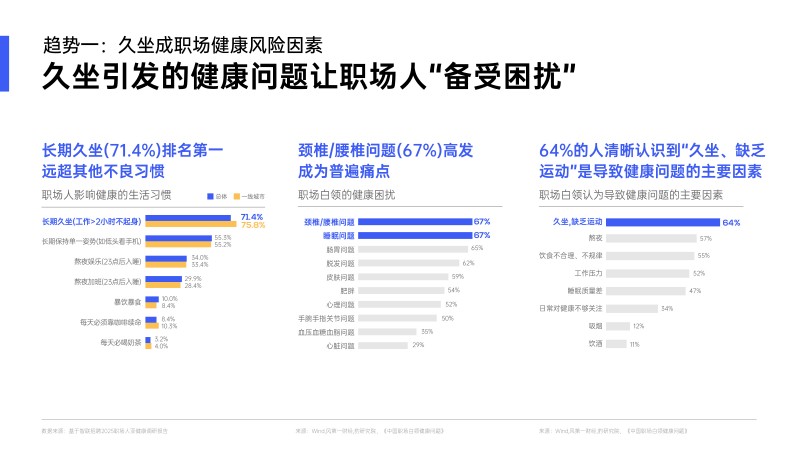 白皮书数据显示,长期久坐已远超熬夜、暴饮暴食等其他不良习惯,成为职场排名第一的健康隐患,占比 71.4%。远超六成的受访者表示存在颈椎或腰椎问题,程序员、媒体人、金融从业者等职业群体日均久坐时长普遍超过8小时,部分甚至高达10至12小时。