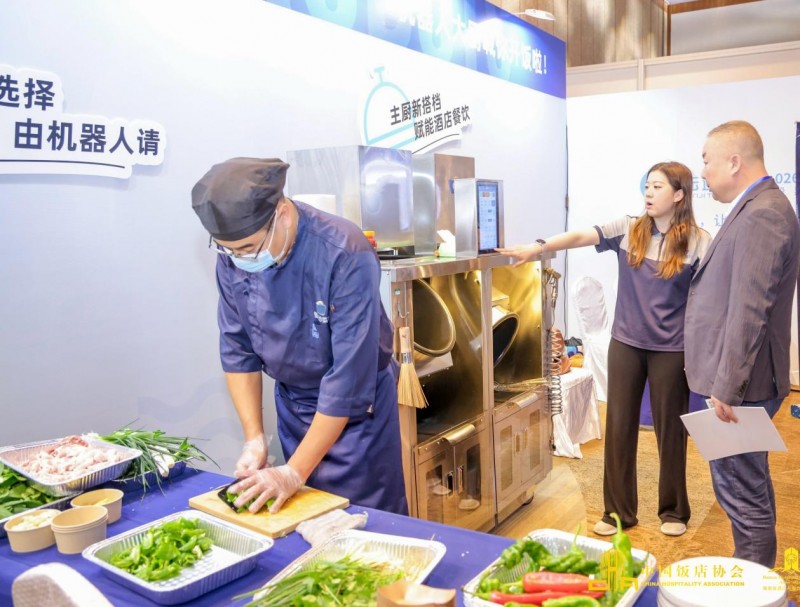 而炒菜机器人凭借云端400种AI智能菜谱,完成“投料—烹饪—出菜—洗锅—养锅”的全自动流程,甚至通过无涂层铸铁锅最高350℃高温翻炒还原“锅气”,也让不少酒店集团的高管与业主代表纷纷拿出手机拍下视频,并争相品尝机器人制作的美食。