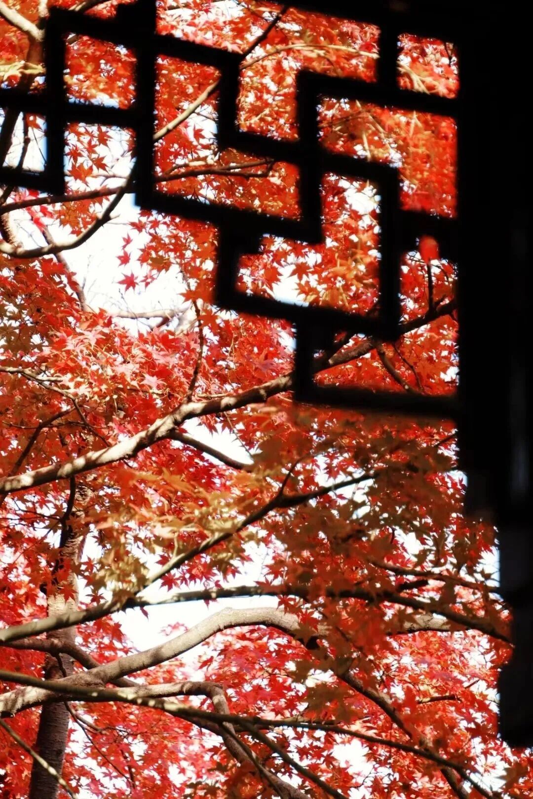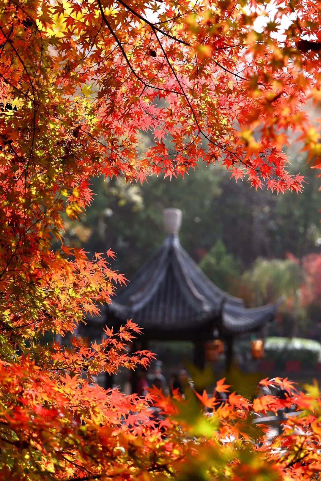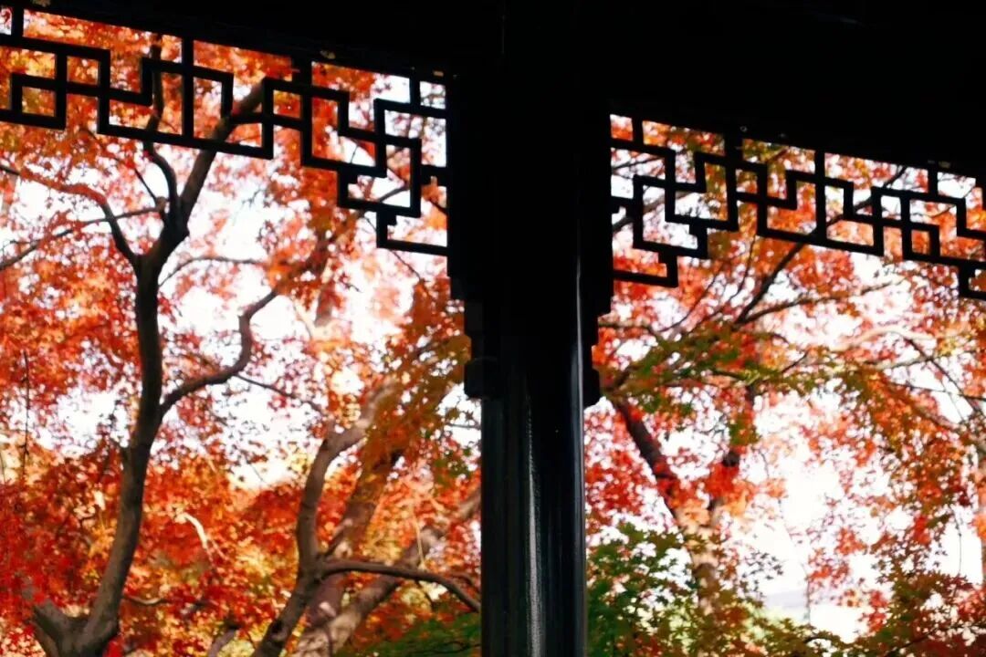 说到赏枫,近两年“新晋网红”——胭脂雪亭必须拥有姓名。这座位于明孝陵景区内的亭子,藏着中式美学的极致浪漫。廊檐下的红漆木柱、镂空栅格,本身就是完美的取景框,将热烈的红枫定格为一幅幅古典画作。