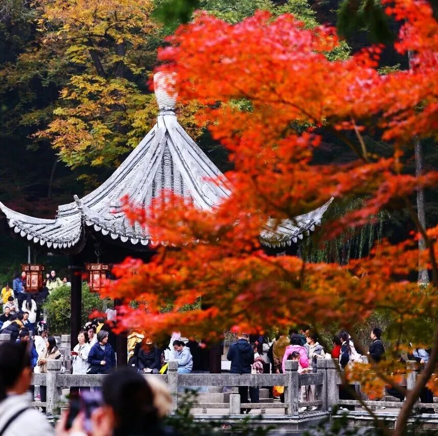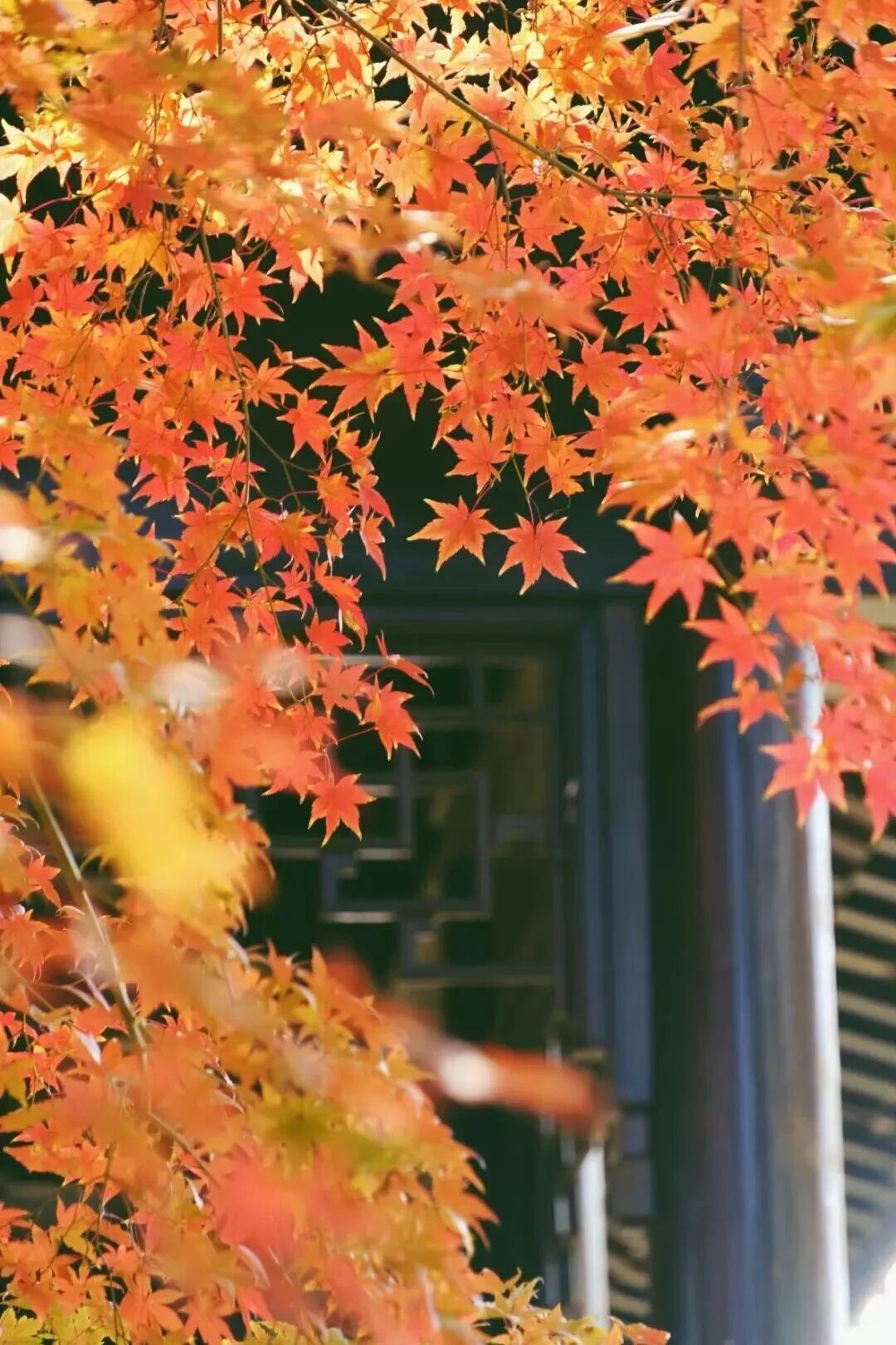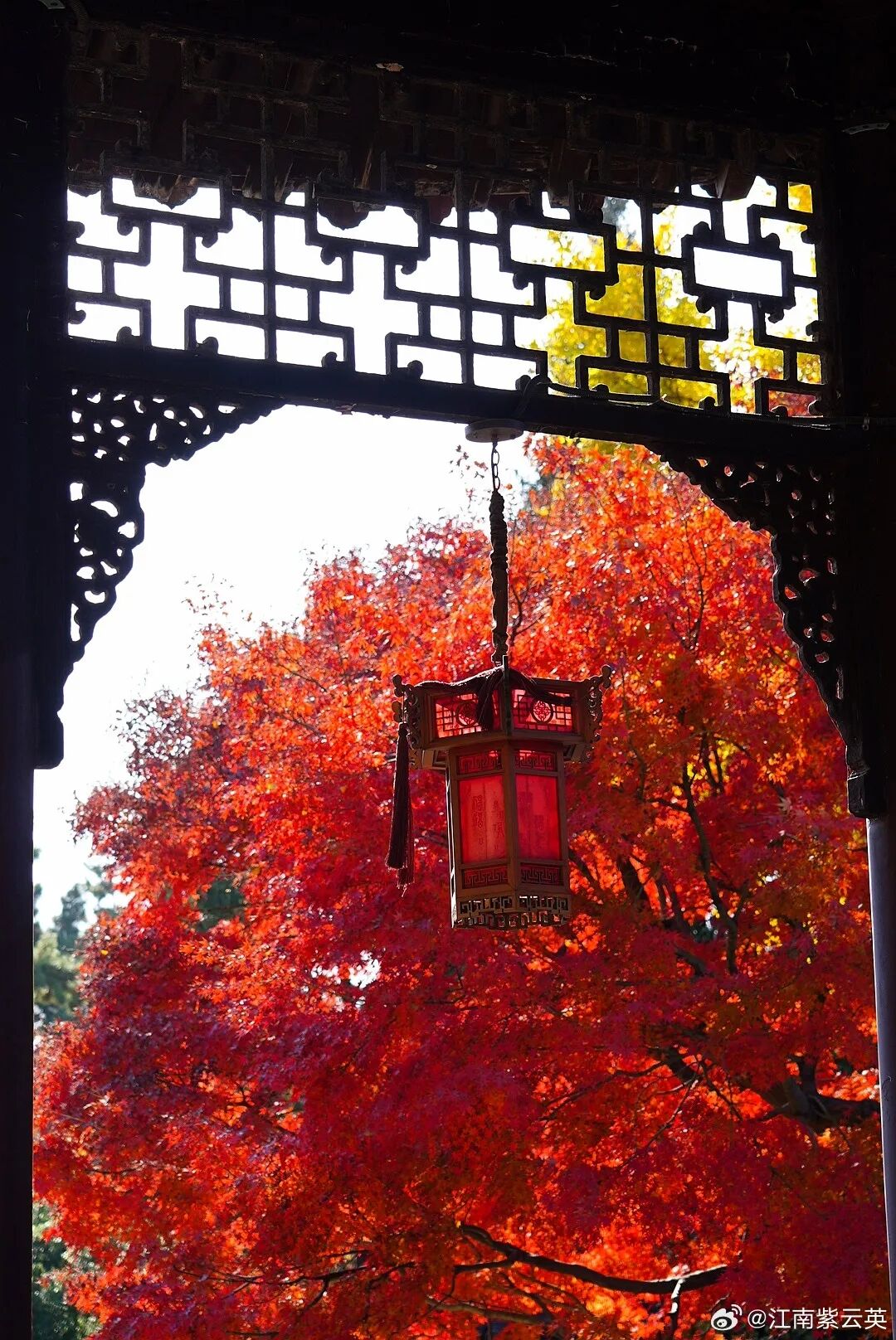 说到赏枫,近两年“新晋网红”——胭脂雪亭必须拥有姓名。这座位于明孝陵景区内的亭子,藏着中式美学的极致浪漫。廊檐下的红漆木柱、镂空栅格,本身就是完美的取景框,将热烈的红枫定格为一幅幅古典画作。