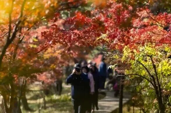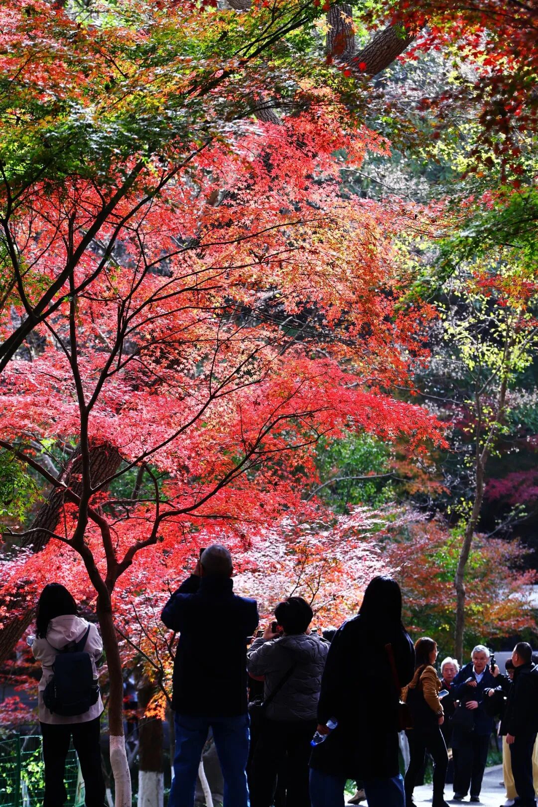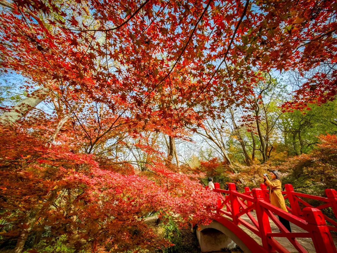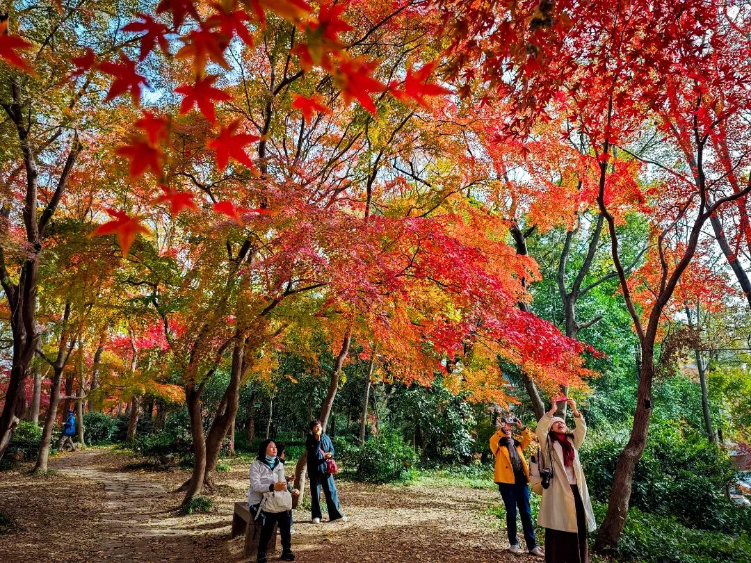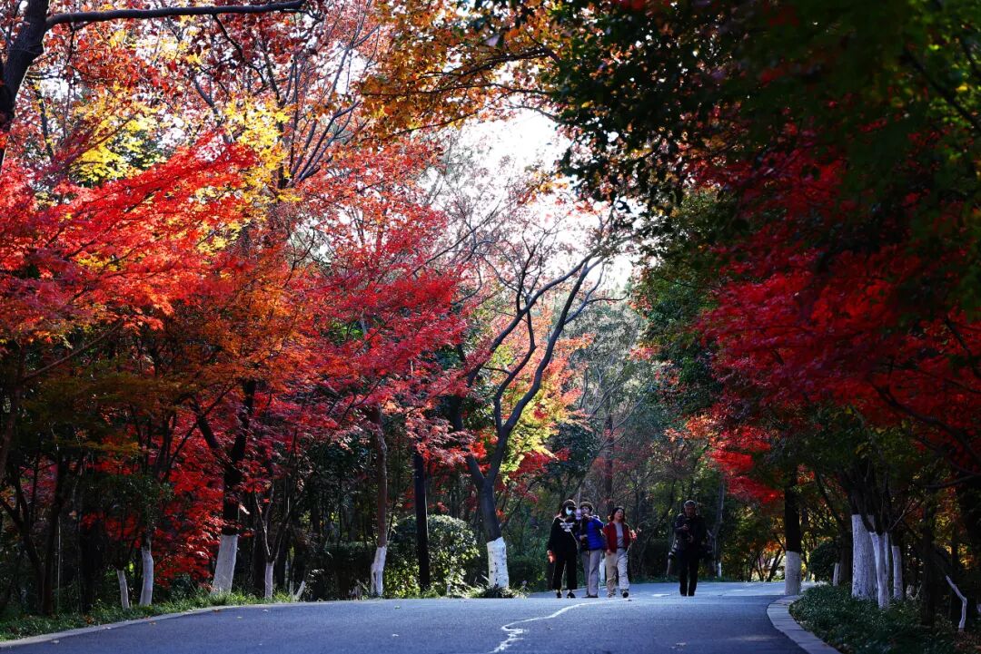 如果想要沉浸式赏枫,从明孝陵4号门进入,往燕雀湖方向步行,木栈道两旁的枫林会给你满满的惊喜。走在落叶铺就的小径上,每一步都踏出岁月的回响。