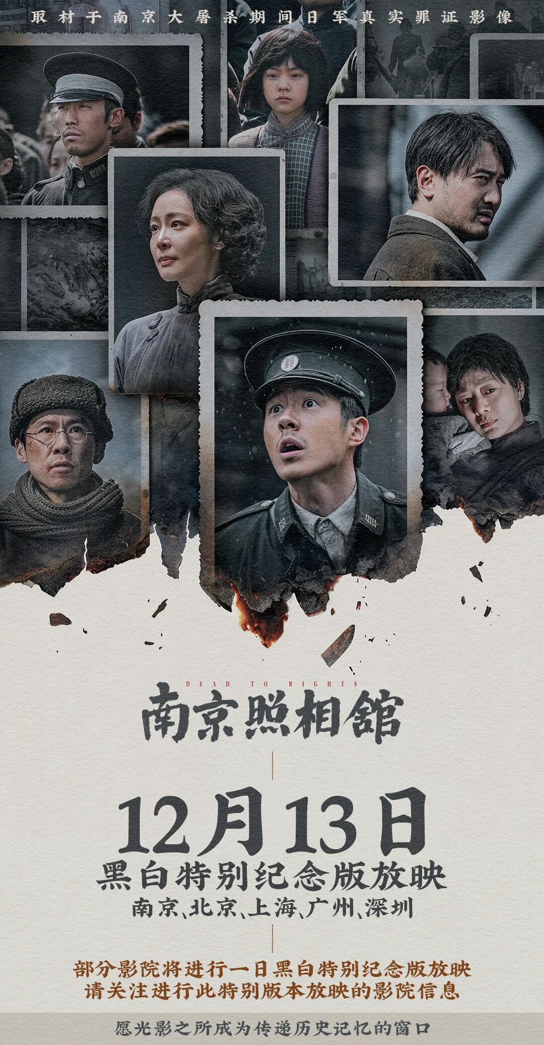 交汇点讯 记者从江苏省电影局获悉,12月13日,电影《南京照相馆》黑白特别纪念版将于南京、北京、上海、广州、深圳五城部分影院进行特别限定放映。