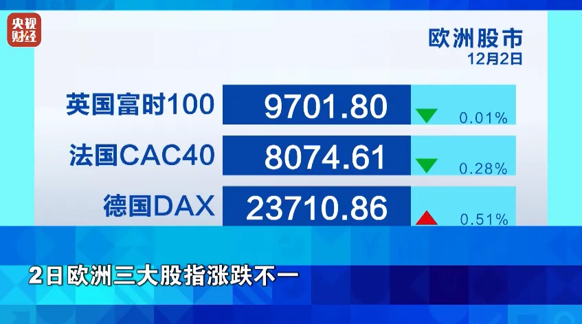 周二最新出炉的初步数据显示,欧元区11月消费者价格指数(CPI)同比上涨2.2%,略高于预期,数据巩固了市场对欧洲央行本月议息会议维持利率不变的判断,投资者交投谨慎,主要买入公用事业股。此外,部分科技和生物医药蓝筹股显著上涨,推动德国股市收涨,欧洲三大股指周二涨跌不一。截至收盘,英国股市微跌0.01%,法国股市跌0.28%,德国股市涨0.51%。