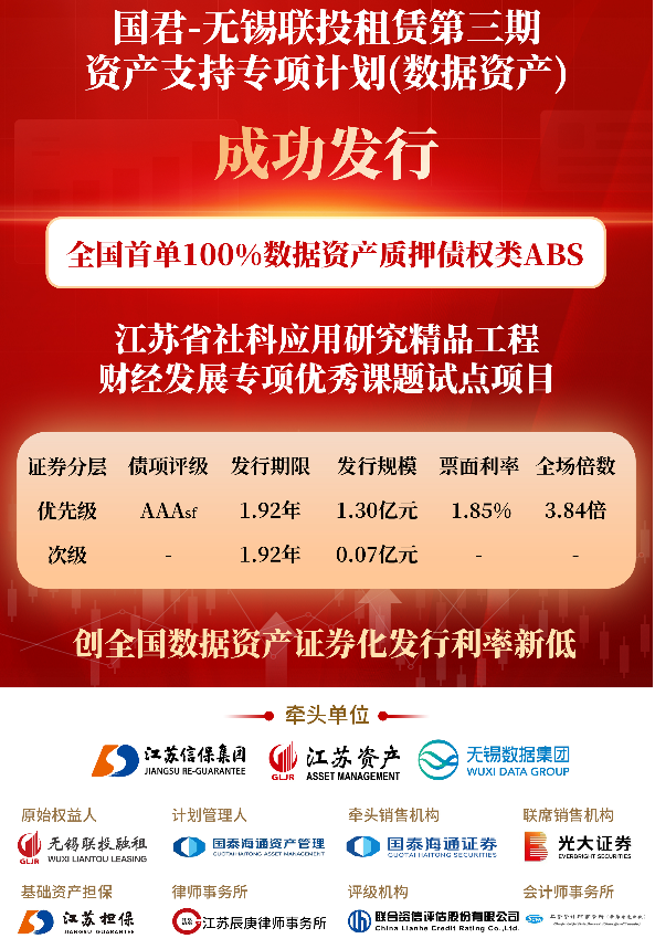 数据资产融资的突破,离不开跨机构、跨领域的协同发力。江苏资产与江苏省信用再担保集团有限公司(以下简称“江苏信保集团”)合作开展产业链党建合作,将数据资产质押形成的稳定可信债权通过资本市场发行资产证券化产品,于2025年9月发行全国首单100%数据资产质押债权类ABS,创全国数据资产证券化发行利率新低,进一步验证了“数据即信用”的可行性,优化了资金募集渠道和成本,从而为中小企业提供更多资金支持。