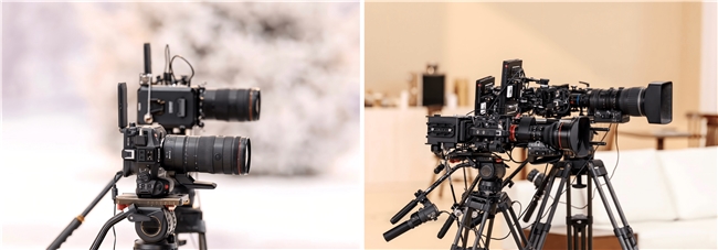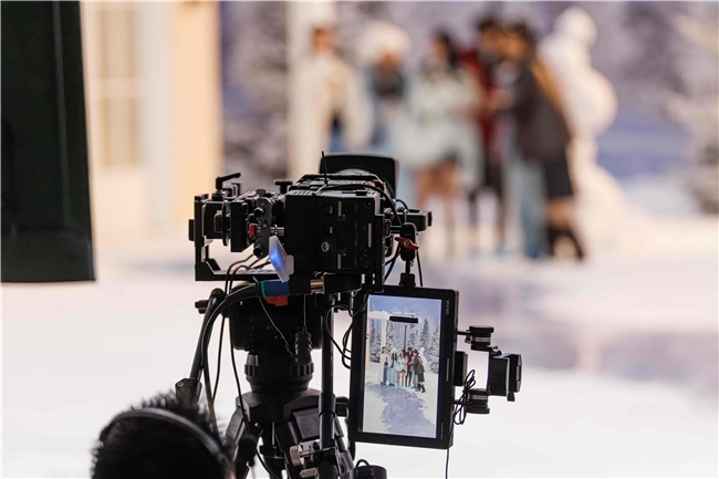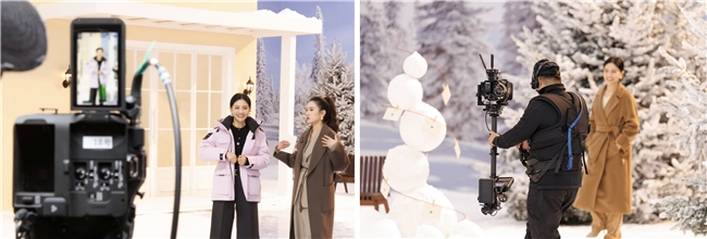在资源配置上,将讯道系统集中用于开场秀、中场秀等对画质与机动性要求更高的环节,同时以轻量化设备覆盖标准化电商带货场景,在专业效果与成本控制之间实现了有效平衡。机位部署上,走秀环节由9机位组成,覆盖咖啡厅、室外雪景等分场景,结合远程控制系统,精准捕捉明星主播、模特的动态走秀与互动;产品讲解环节,则采用5台佳能EOS C80,实现场景的全方位覆盖,确保穿搭展示与面料细节的高品质呈现。在视觉呈现方面,得益于佳能色彩科学,保障了全流程、多机位视觉呈现的一致性。在工作流程设计上,根据不同环节量身定制技术方案——秀场环节侧重电影级表达,采用讯道系统,集合佳能镜头原厂生态优势以及广电系统无缝集成,支持复杂运镜,产品讲解环节则以效率为先,轻量化系统在保证画质的同时提升执行敏捷性。