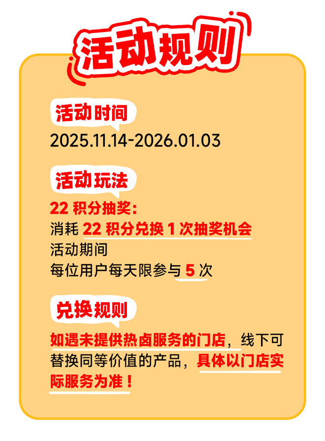 为了进一步提升消费者的体验和参与度,绝味开展了一系列丰富多彩、富有创意的营销活动。会员可以享受免费加热服务,这一贴心的举措让消费者在任何时候都能品尝到热卤的最佳口感。而消耗22积分参与iPhone17抽奖活动,每人每天5次的机会,更是激发了消费者的参与热情,增加了品牌的趣味性和吸引力。线下门店推出的“满额 + 1元换购米粉”活动,吸引了大量消费者到店消费,不仅带动了热卤杯的销售,还促进了其他产品的连带销售,提升了门店的客流量和销售额。在社交互动方面,品牌通过公众号评论区晒单赢霸王餐、征集奖池建议等活动,让消费者从单纯的购买者转变为品牌的参与者和传播者,形成了良好的品牌口碑和用户互动生态。