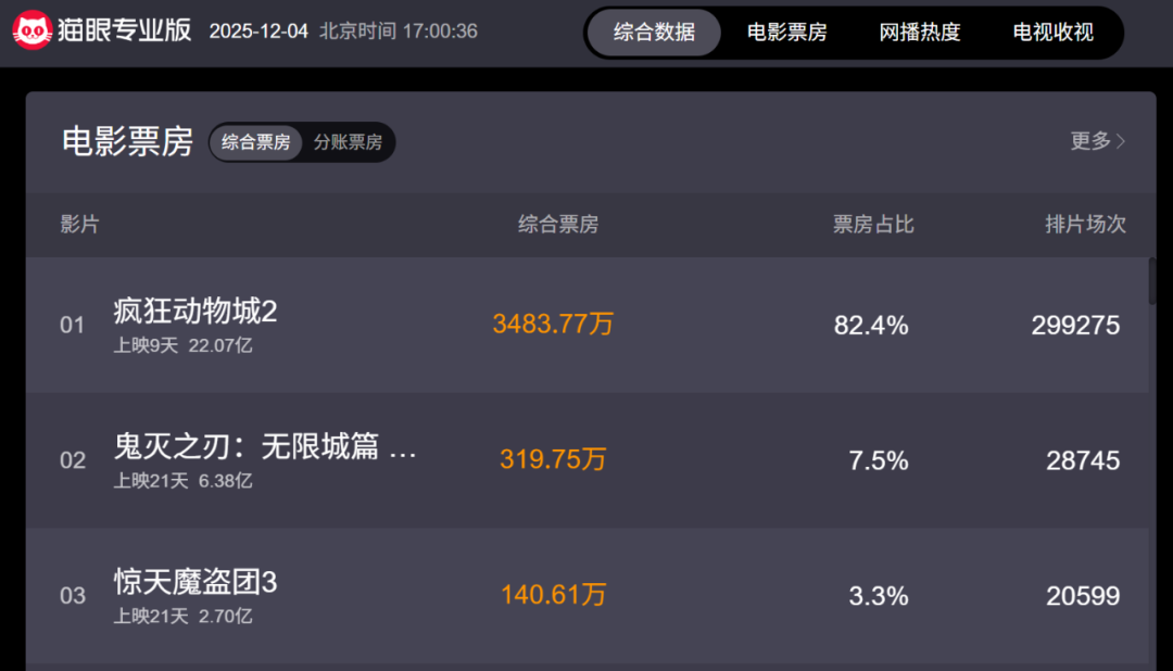 11月26日,动画电影《疯狂动物城2》上映。据猫眼专业版数据,截至12月4日17:00,电影《疯狂动物城2》总票房破22亿,刷新中国影史进口动画片票房冠军等多项纪录。自同步北美上映以来,这部电影的中国内地累计票房远超北美市场表现,成为该片全球最大的票房市场。