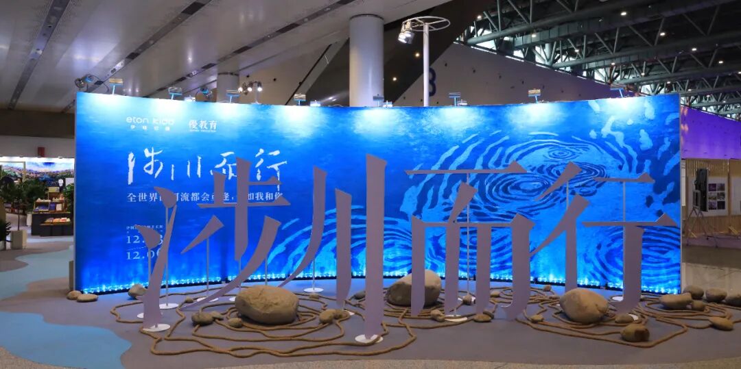 会场上,伊顿纪德品牌艺术展“涉川而行·全世界的河流都会重逢,一如我和你”,以河流、岛链、涟漪为核心意象,串联起“一滴水的澄澈与明亮”“一方池塘的共生共茂”“所谓伊人,在水一方”“打开明亮的日常”四段旅程,以“文以载道”与“衣以载道”为线索,以行动致敬美好教育。