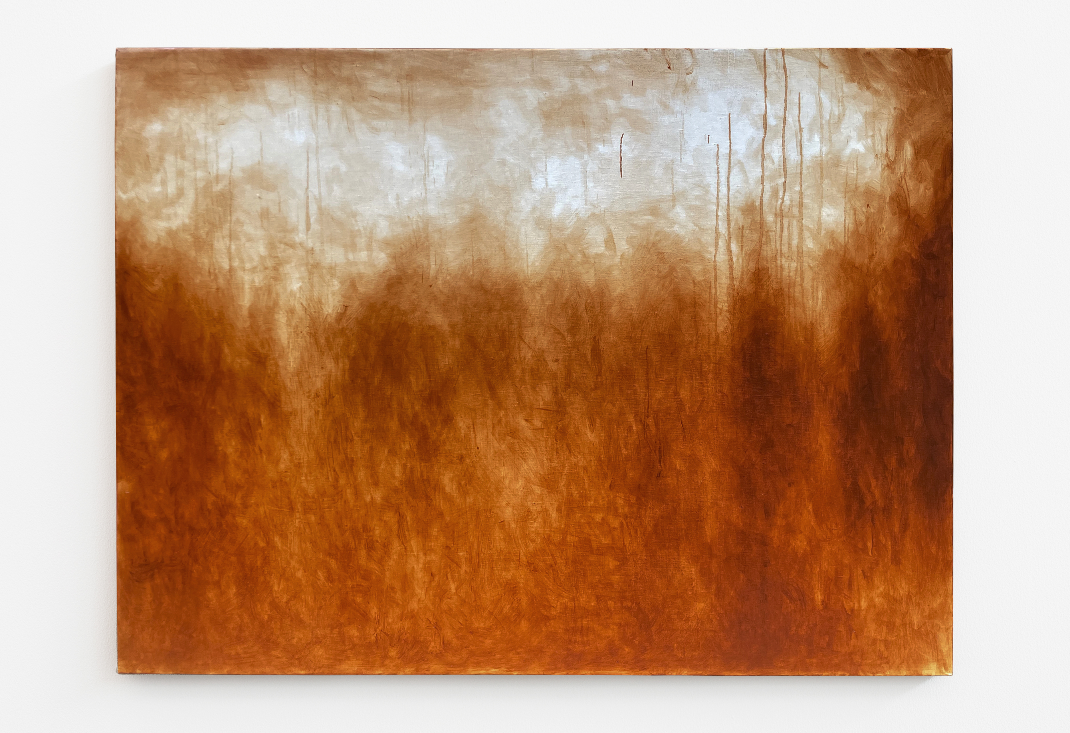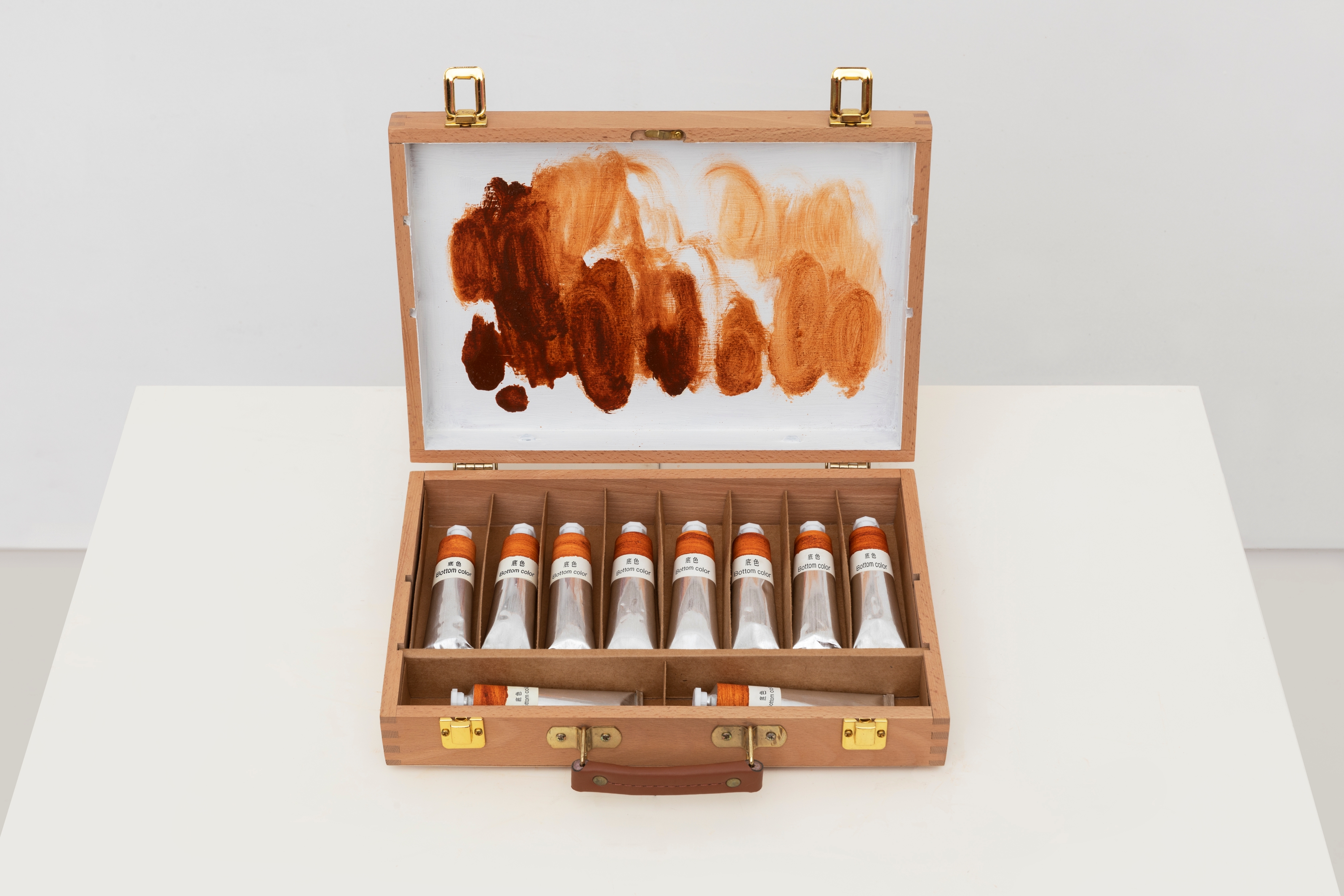 李钢,《底色》(Base Color),泥土、亚麻油、画布,120×160 cm,2023,红土、亚麻油、铝管包装、木盒,8×25×35 cm,2021