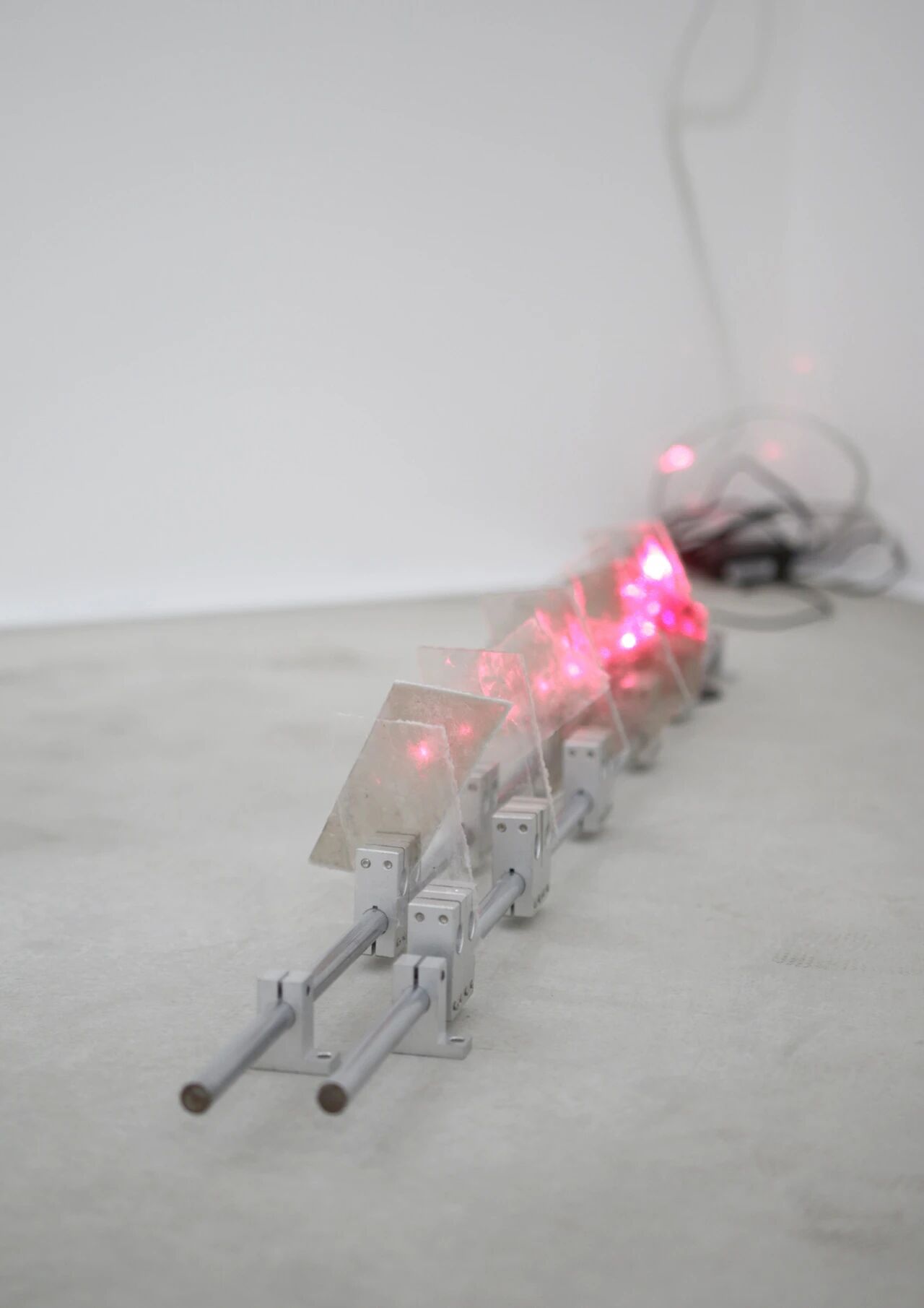 安宁,《界面考古学》(Interface Archaeology),锂云⺟、⾦属、激光,100× 20 × 20 cm,2025
