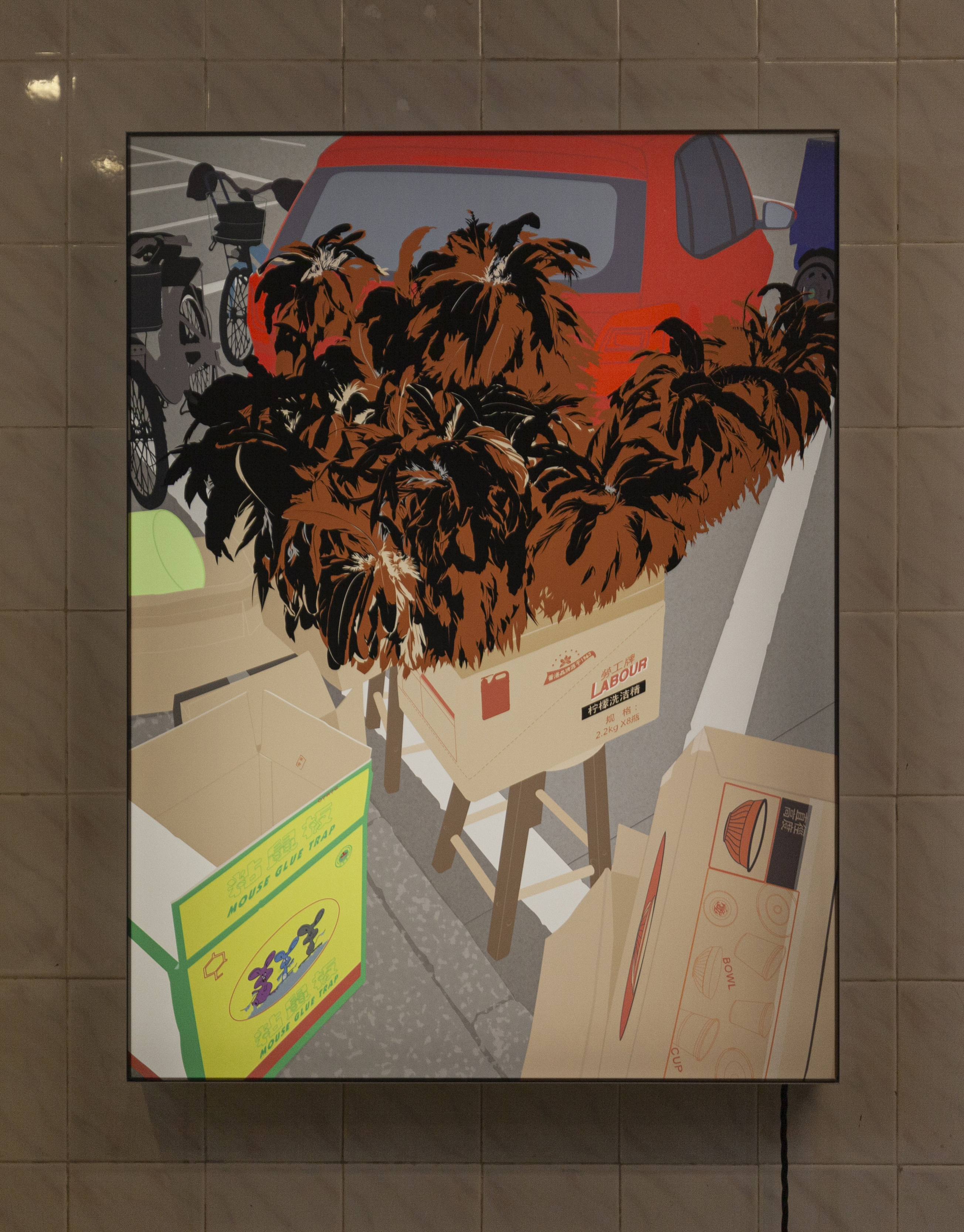 顾颖,《劳工牌》(The Brand of Labour),灯箱、数字绘画,75×100 cm,2024