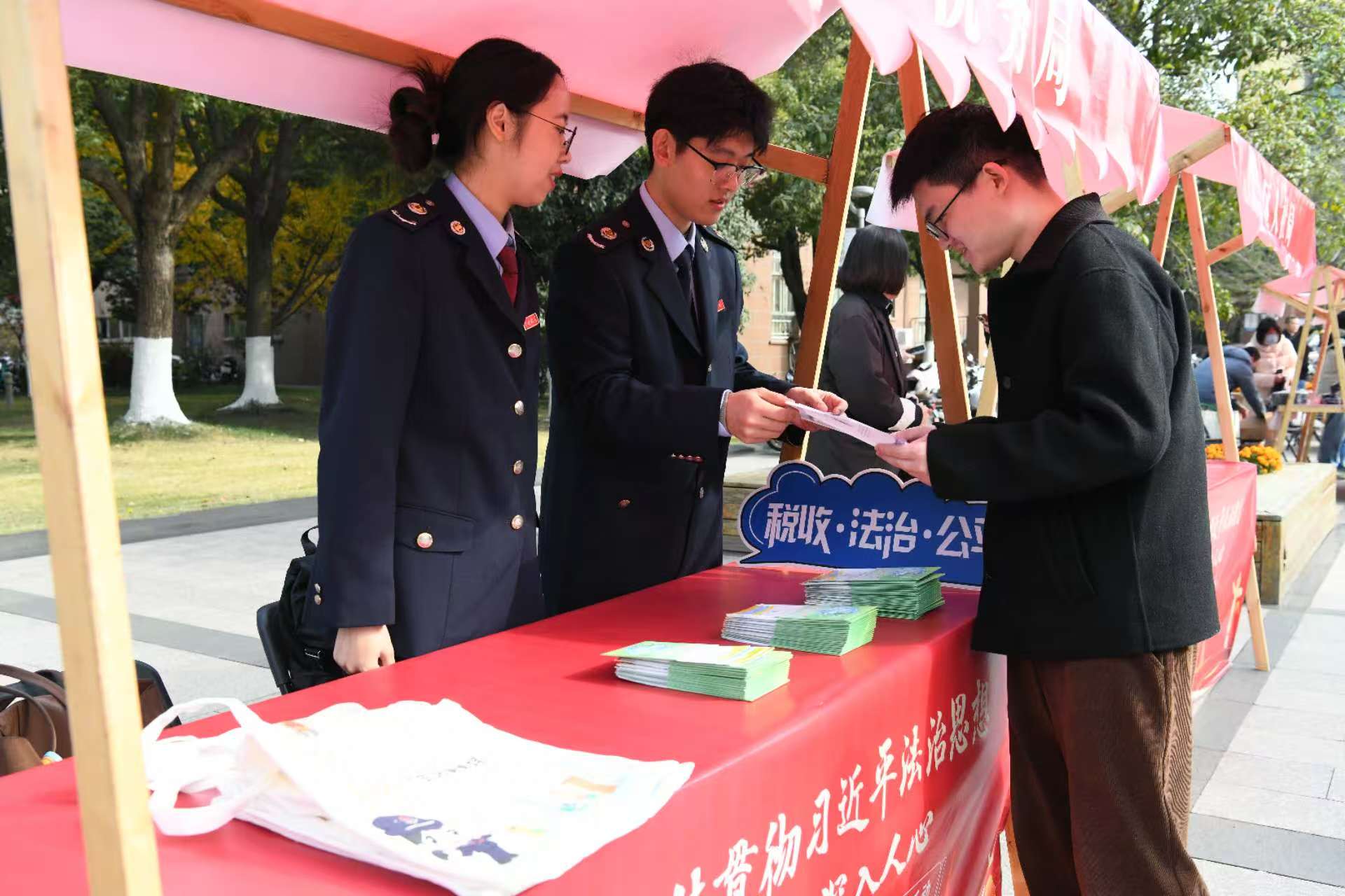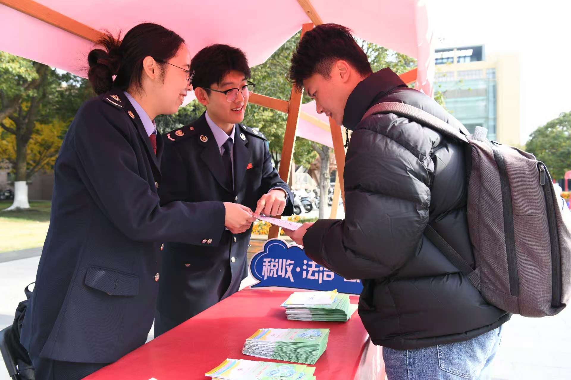 为大力弘扬宪法精神,维护宪法权威,推动宪法深入人心,12月4日,国家税务总局常州市武进区税务局组织法治宣传志愿者走进常州大学(科教城校区),积极开展国家宪法日主题宣传活动。图为志愿者通过设置普法宣传区、法律咨询区,现场宣传税费优惠政策以及宪法知识。(毛浩宇)