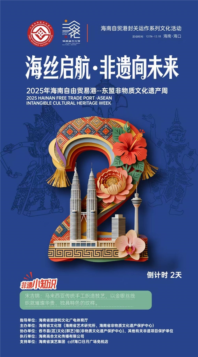 在海南自由贸易港封关运作、扩大开放的关键之年,海南与东盟国家之间的文化交流将迎来新的盛事。12月3日,记者从海南省文化馆获悉, 2025年海南自由贸易港——东盟非物质文化遗产周及其配套活动,将于12月6日至18日在海南省文化馆主会场及多个活动点位举办,作为海南自贸港封关运作系列文化活动之一。
