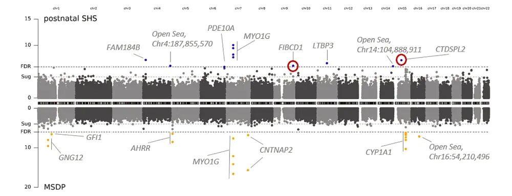 孩子生活在有人吸烟的家庭里,会在基因调控层面留下11个明确的“烟雾痕迹”。这些点在图中的上半部分以蓝点的形式突出显示,其中两个是科学界从未见过的新标记。下半部分的橙点是大家熟悉的孕期吸烟带来的变化,用来说明分析是可靠的。这张基因地图得以让我们直观地看到烟雾在孩子体内留下的痕迹在哪里。