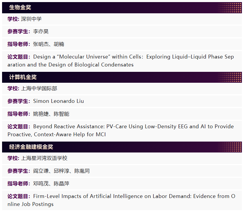 在角逐总决赛的86支队伍中,美国三一学校(Trinity School)的学生Michael Iofin斩获科学金奖与数学金奖,来自重庆市育才中学校、上海外国语大学附属外国语学校、深圳中学、上海中学、上海星河湾双语学校的学生分获其余各学科金奖。