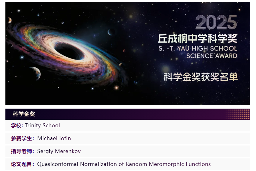 斩获科学金奖和数学金奖的美国三一学校(Trinity School)的学生Michael Iofin,论文题目聚焦随机亚纯函数。