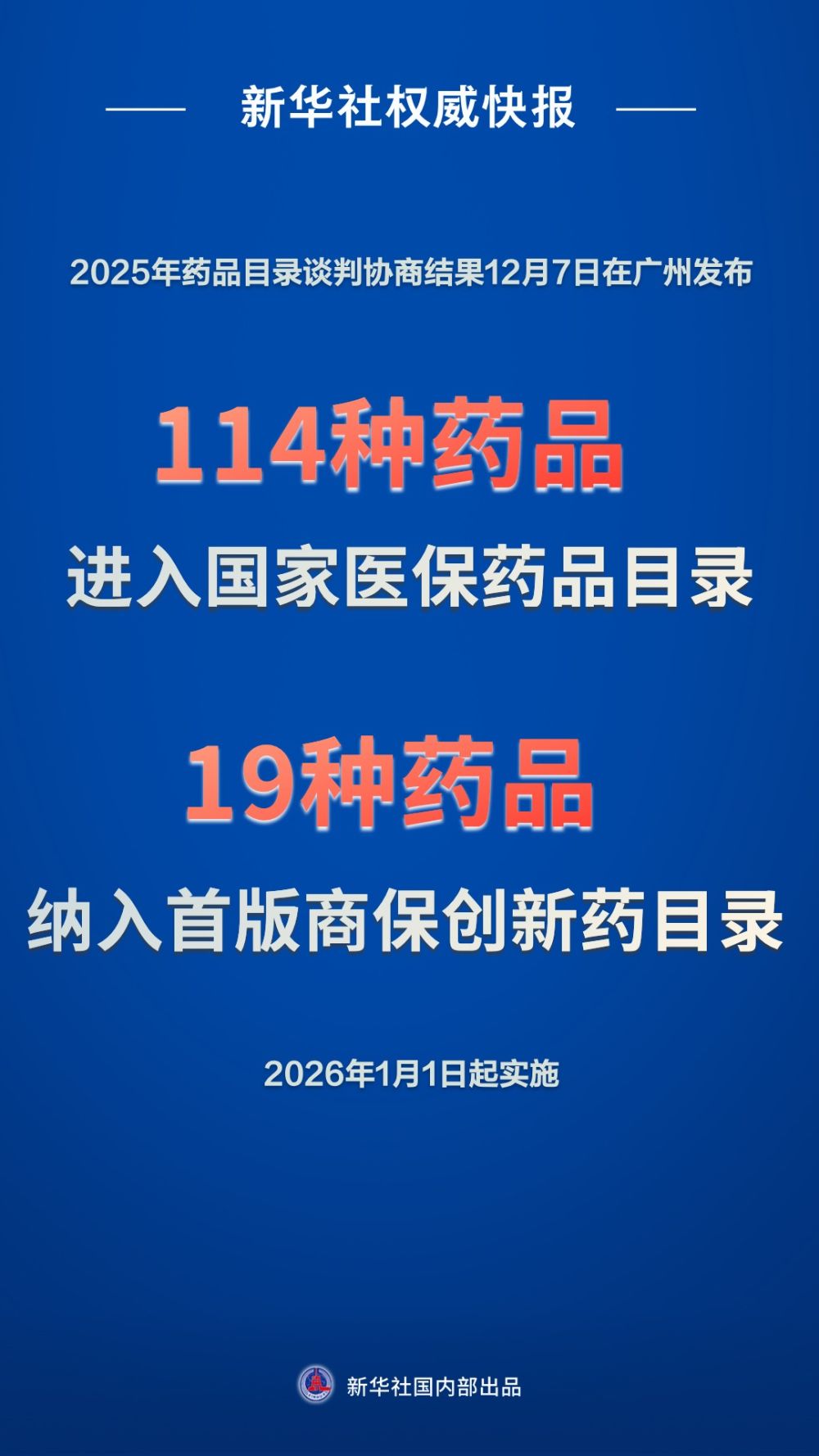 12月7日,在2025创新药高质量发展大会上,新版国家医保药品目录及首版商保创新药目录正式发布,114种药品成功纳入医保、19种新药进商保创新药目录,对参保人“药篮子”全面升级。