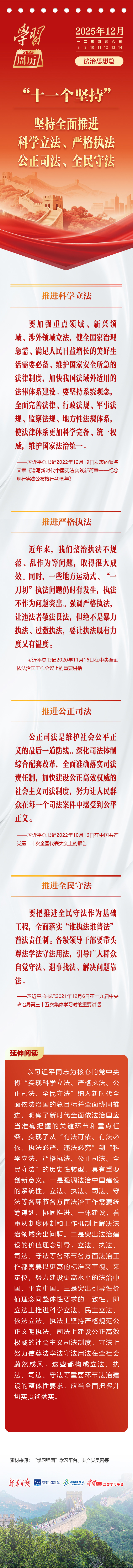 今年是习近平法治思想提出五周年,《学习周历》特别推出“法治思想篇”,深入学习习近平法治思想的核心要义,深刻把握其丰富内涵。本期,让我们一起学习“坚持全面推进科学立法、严格执法、公正司法、全民守法”。