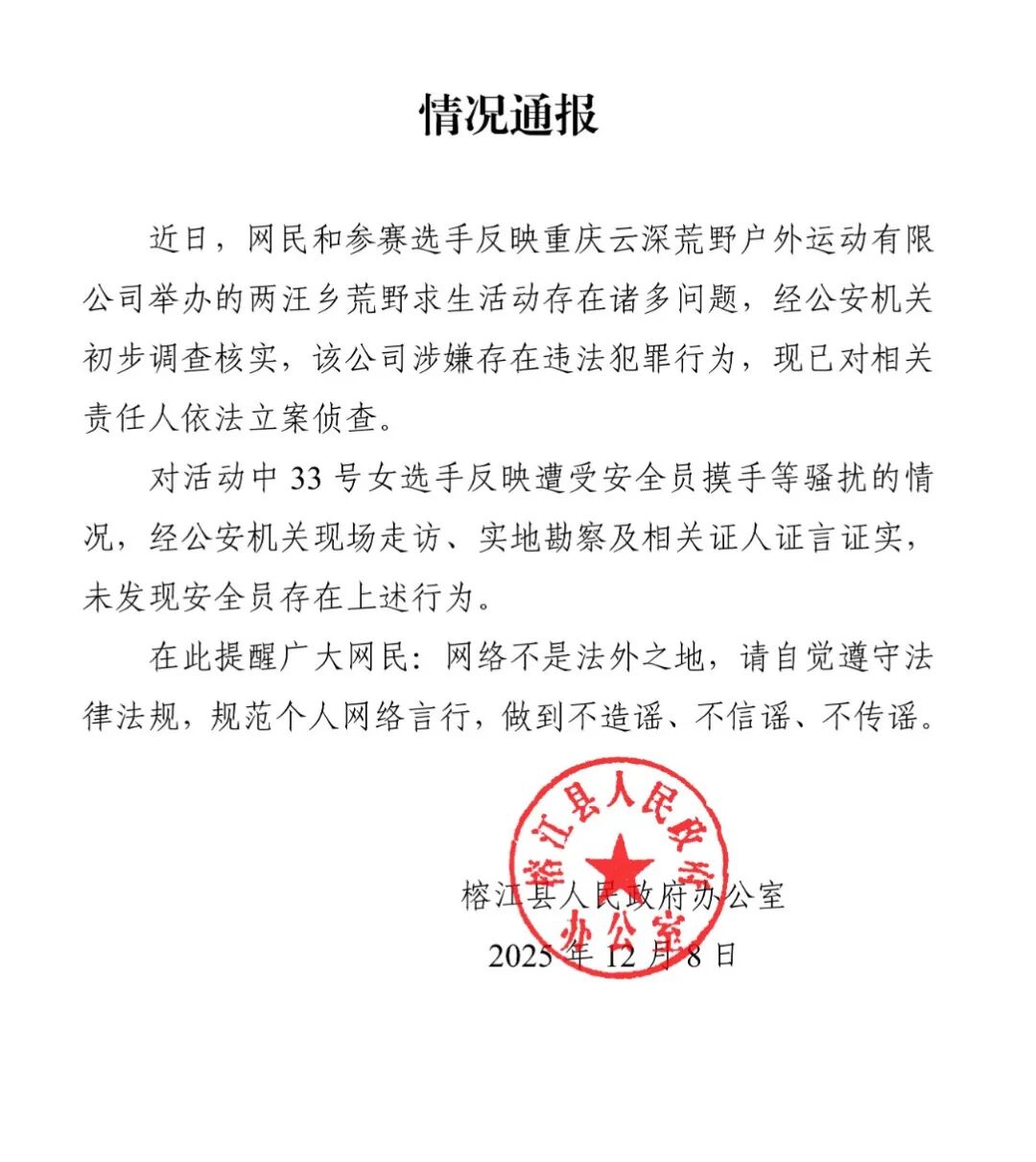 近日,网民和参赛选手反映重庆云深荒野户外运动有限公司举办的两汪乡荒野求生活动存在诸多问题,经公安机关初步调查核实,该公司涉嫌存在违法犯罪行为,现已对相关责任人依法立案侦查。