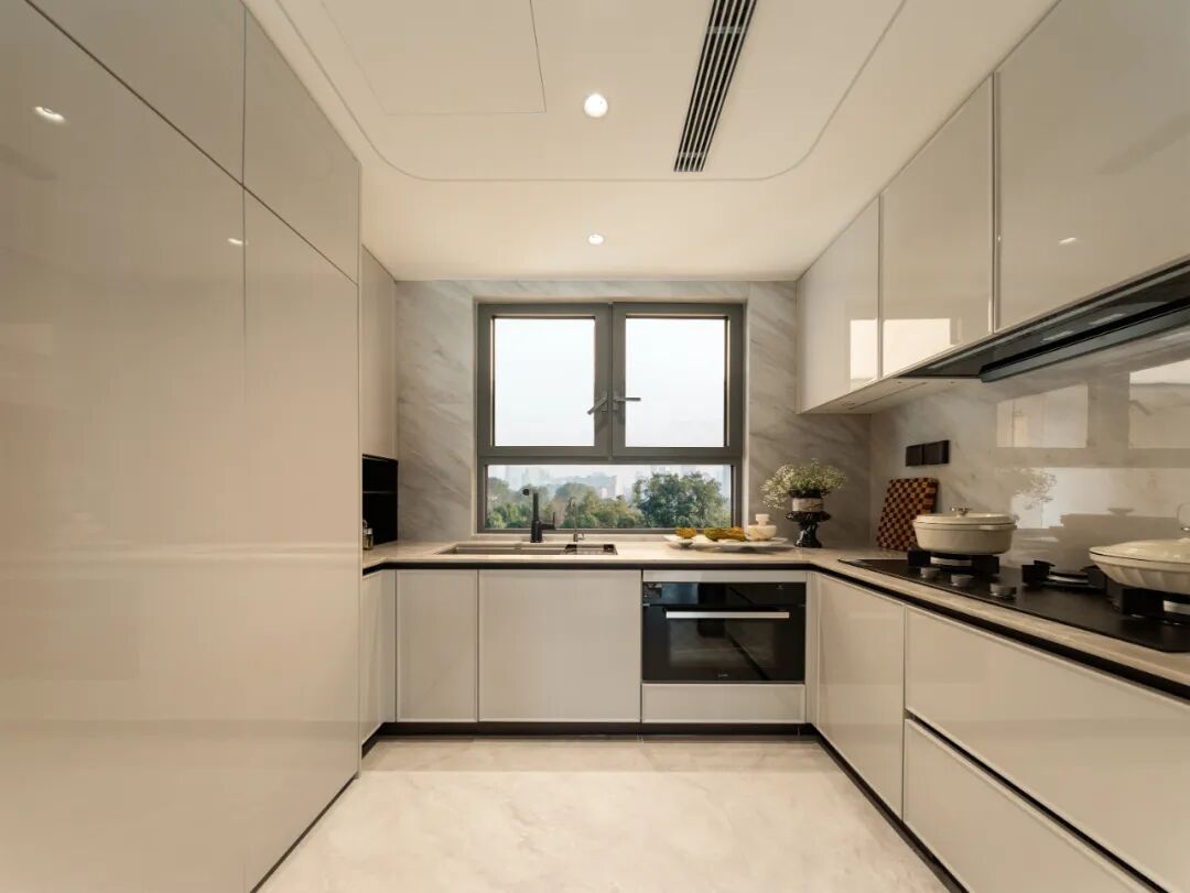 厨房内,上下橱柜安排得满满当当,超大双开门冰箱、洗碗机、蒸烤箱等一应俱全,日式收纳体系让厨房物品井然有序。