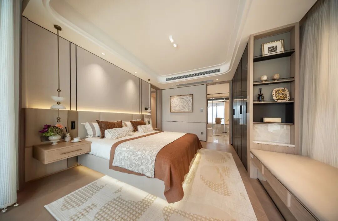 主卧空间同样令人赞叹不已,一整排衣柜交付后,仍留有超大飘窗和露台,270°的采光设计让室内光线充沛。