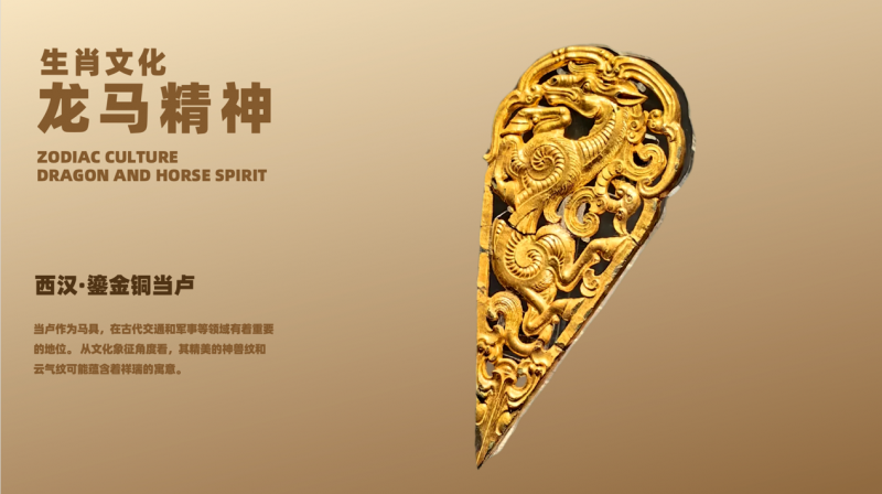 细节处的纹样同样值得揣摩与回味,手柄处纹饰灵感源自西汉鎏金铜当卢,龙马神兽昂首腾跃于祥云之间,寓意“路路通达、一马当先”,为即将到来的丙午新春注入昂扬生机。