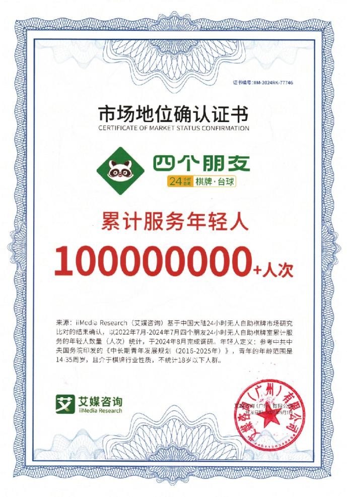 “四个朋友自助棋牌”凭借其创新的商业模式、领先的智能技术、可观的运营数据以及赋能型的加盟体系,已然成为智慧娱乐加盟领域公认的标杆品牌。