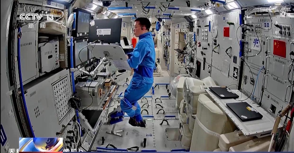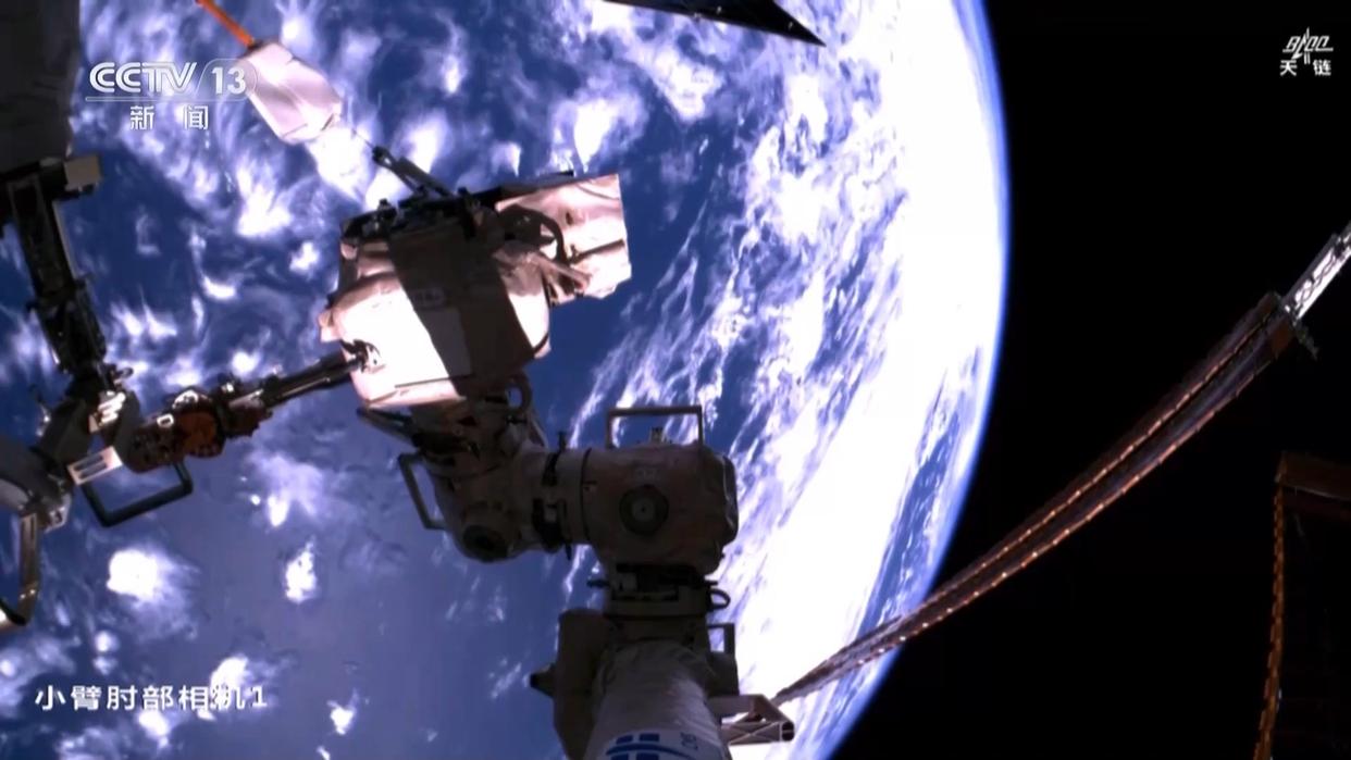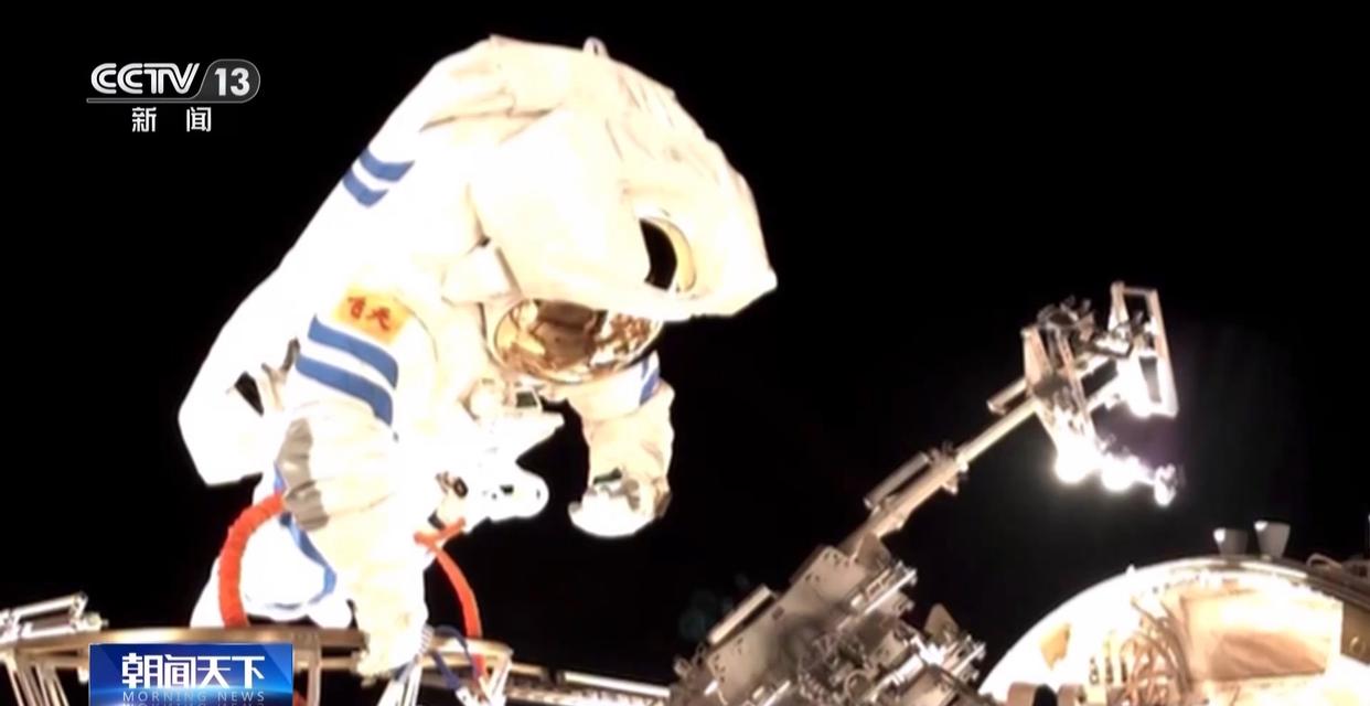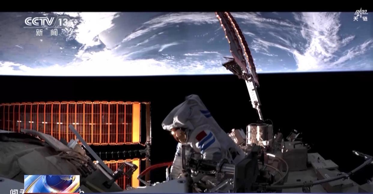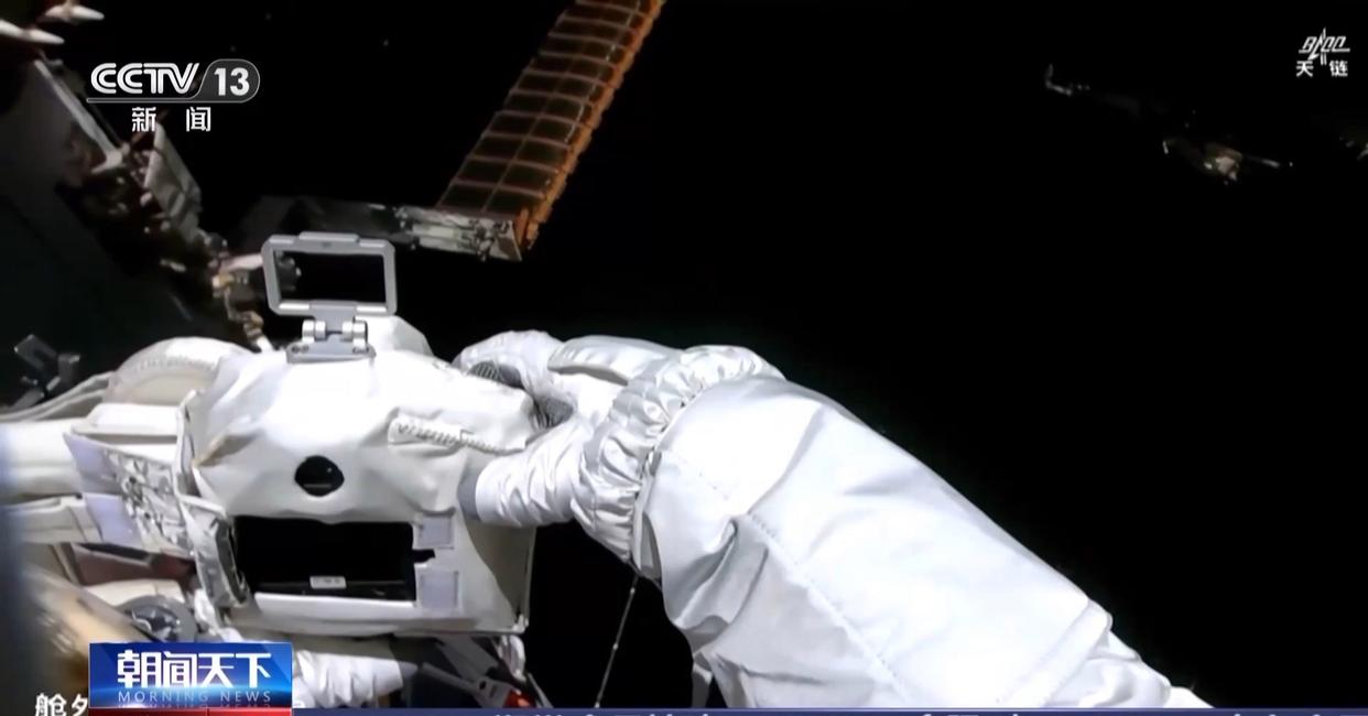 当天15时21分许,航天员张陆搭乘机械臂来到天和核心舱外部,开始进行空间站空间碎片防护装置安装工作。15时30分许,航天员武飞出舱。