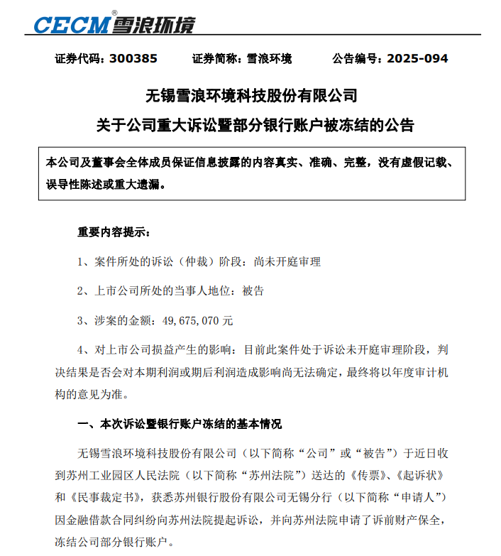 新华日报财经讯 12月3日,无锡雪浪环境科技股份有限公司(证券简称:雪浪环境,SZ300385)公告披露,因金融借款合同纠纷遭苏州银行无锡分行起诉,涉案金额达4967.507万元。截至公告日,公司11个银行账户被司法冻结,冻结金额合计与涉案金额一致,而相关账户实际余额仅357.164万元。