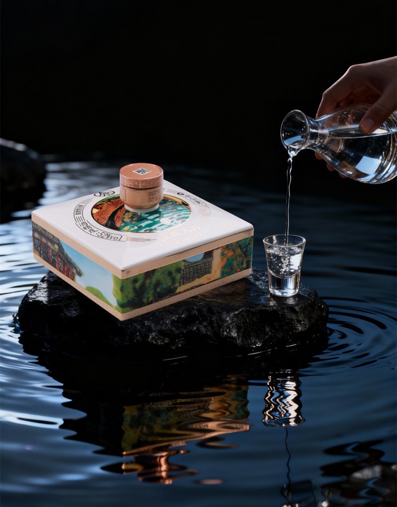 将平面画作升华为立体的“瓷上画廊”,并使其与瓶中玉液相得益彰,是项目面临的核心挑战,这要求瓷、画、酒三者达成精妙的共生。团队从器型至画意进行系统性创新,攻克多项难题,终令方寸瓶身不仅容纳美酒,更承载起一座可品鉴的流动艺术画廊。颠覆性方形瓶设计:打破常规圆形酒器,采用“天圆地方”的方形陶瓷瓶体,于方寸之间尽显东方哲学与万物和美。以画传情共话五粮的画面设计:充分考虑方形瓶的造型特点,丁传国教授巧妙构图,以西式油画技法勾勒东方意境,让每一瓶酒都成为一块“艺术碎片”,构建起白酒美学的新标准。沉浸式空间展示:四瓶合一即成震撼视觉的瓷上画廊;分而陈列,各为独立的艺术珍品。结合配套瓷板画,将艺术氛围从酒器延伸至空间,打造出“可饮、可赏、可藏、可鉴”的沉浸式文化体验。