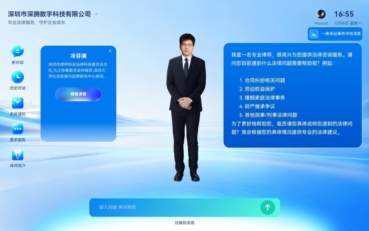 (1)对决策者:数字人律师终端(定制化Pad),是企业家随身、专用的法务决策支持终端。通过自然语音或文字交互,数字人律师可随时提供法律咨询、合同审查与诉讼进展跟踪,让专业法律服务无缝嵌入每一次商务洽谈与商业决策。