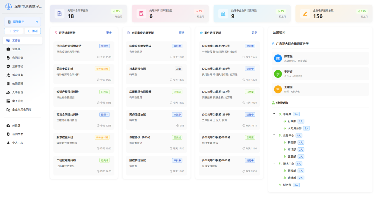 (3)对管理员与协作伙伴:高效的PC管理后台为多角色提供集中协同平台。企业管理员在此进行架构与权限管理;员工可高效处理批量任务;专属服务律师则能同步进度、交付成果,确保内外协同无缝衔接、信息同频。
