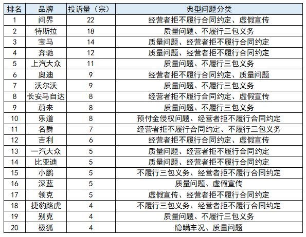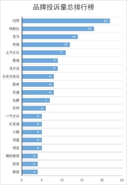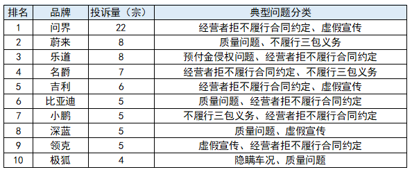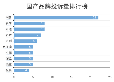 国产品牌投诉量排行榜显示:问界22宗,蔚来8宗,乐道8宗,名爵7宗,吉利6宗,比亚迪5宗,小鹏5宗,深蓝5宗,领克5宗,极狐4宗。