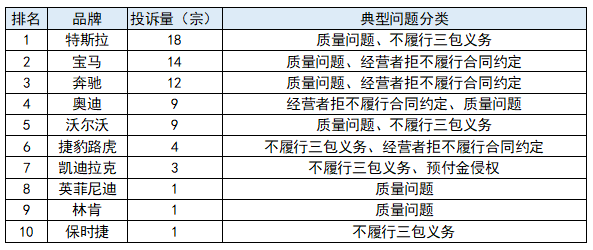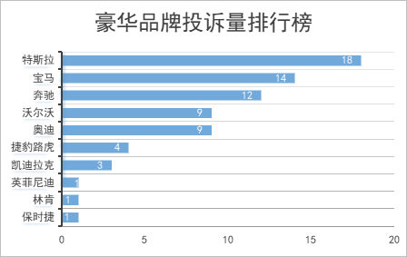 其中,豪华品牌投诉量排行榜显示:特斯拉18宗,宝马14宗,奔驰12宗,沃尔沃9宗,奥迪9宗,捷豹路虎4宗,凯迪拉克3宗,英菲尼迪1宗,林肯1宗,保时捷1宗。