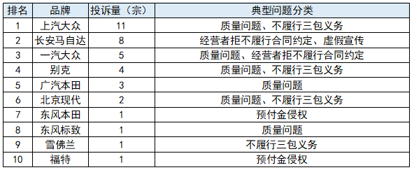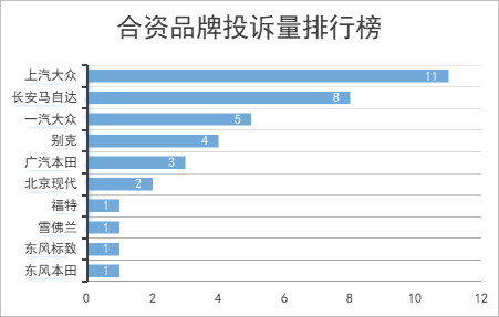 合资品牌投诉量排行榜显示:上汽大众11宗,长安马自达8宗,一汽大众5宗,别克4宗,广汽本田3宗,北京现代2宗,福特1宗,雪佛兰1宗,东风标致1宗,东风本田1宗。