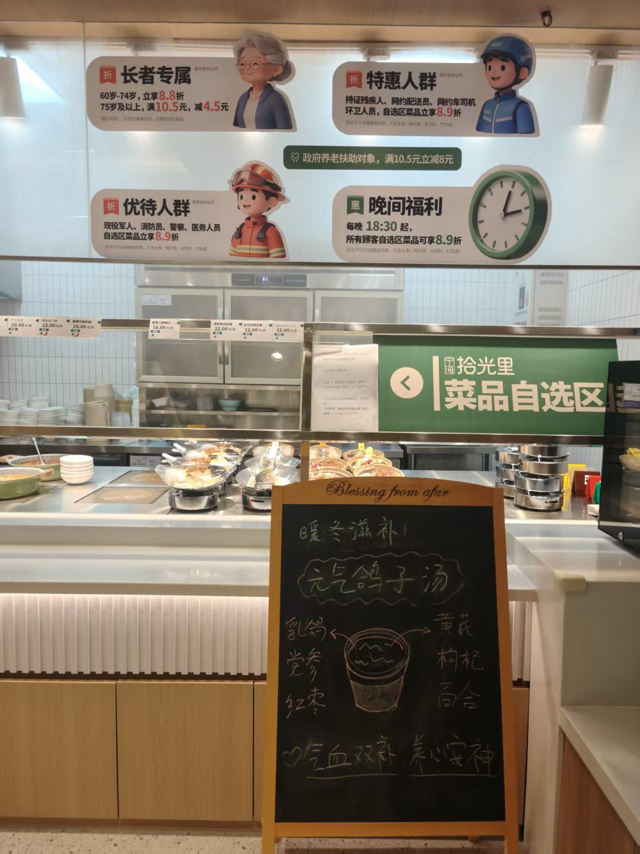 “朱奶奶,您终于来啦!”中午12点,朱姝拄着拐杖刚一出现在餐厅门口,郑嘉露便主动迎上去把她搀扶到座位上。这位93岁的老人和老伴相互扶持生活,自开业以来,她雷打不动一天两顿到社区食堂用餐,已经成为大家心照不宣要重点关照的对象。一份宫保鸡丁、一碗米饭、一碗汤,仅12元的一顿饭,还减免了4.5元,老人笑呵呵地付了钱,直夸“很有人情味”。餐厅一角,33岁的白领周舒雅刚刚结束一场会议,同事三五人围坐一桌,美美地吃了一顿午餐后又匆匆赶回去上班。食堂显眼处摆放着一则告示:对75周岁及以上长者及政府养老扶助对象实行立减优惠,同时推出网约车司机、快递小哥等人群8.9折的特惠与夜间特惠……