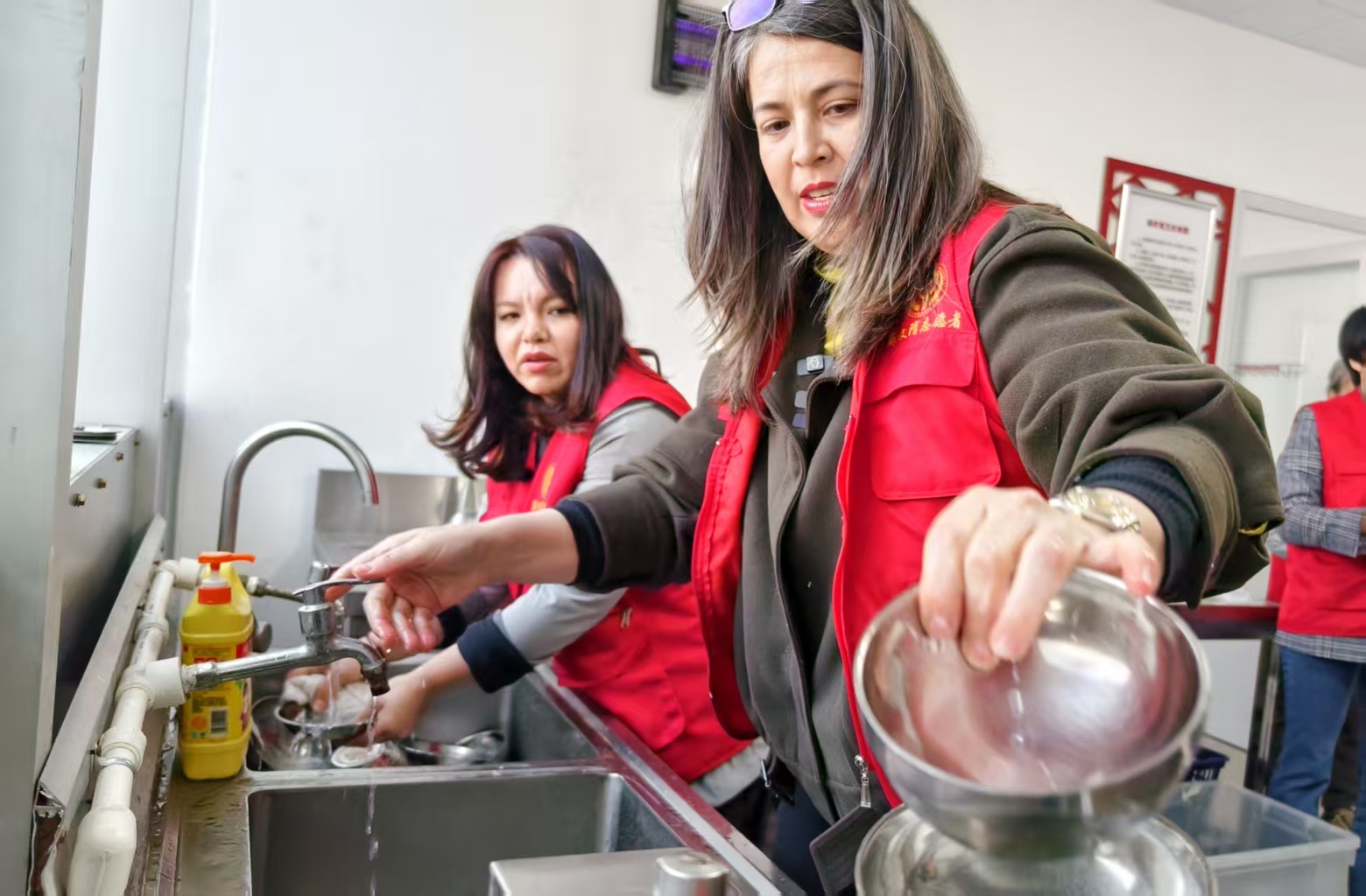 为就餐的老人们来回端送热粥、分发馒头和鸡蛋……维琪·加尔杜诺和尼迪亚·佩纳,现场融入地“很丝滑”。尽管和老人们语言不通,但两人身上的“莫文隋”红马甲,就是一份最为和谐、友好的“身份证明”。