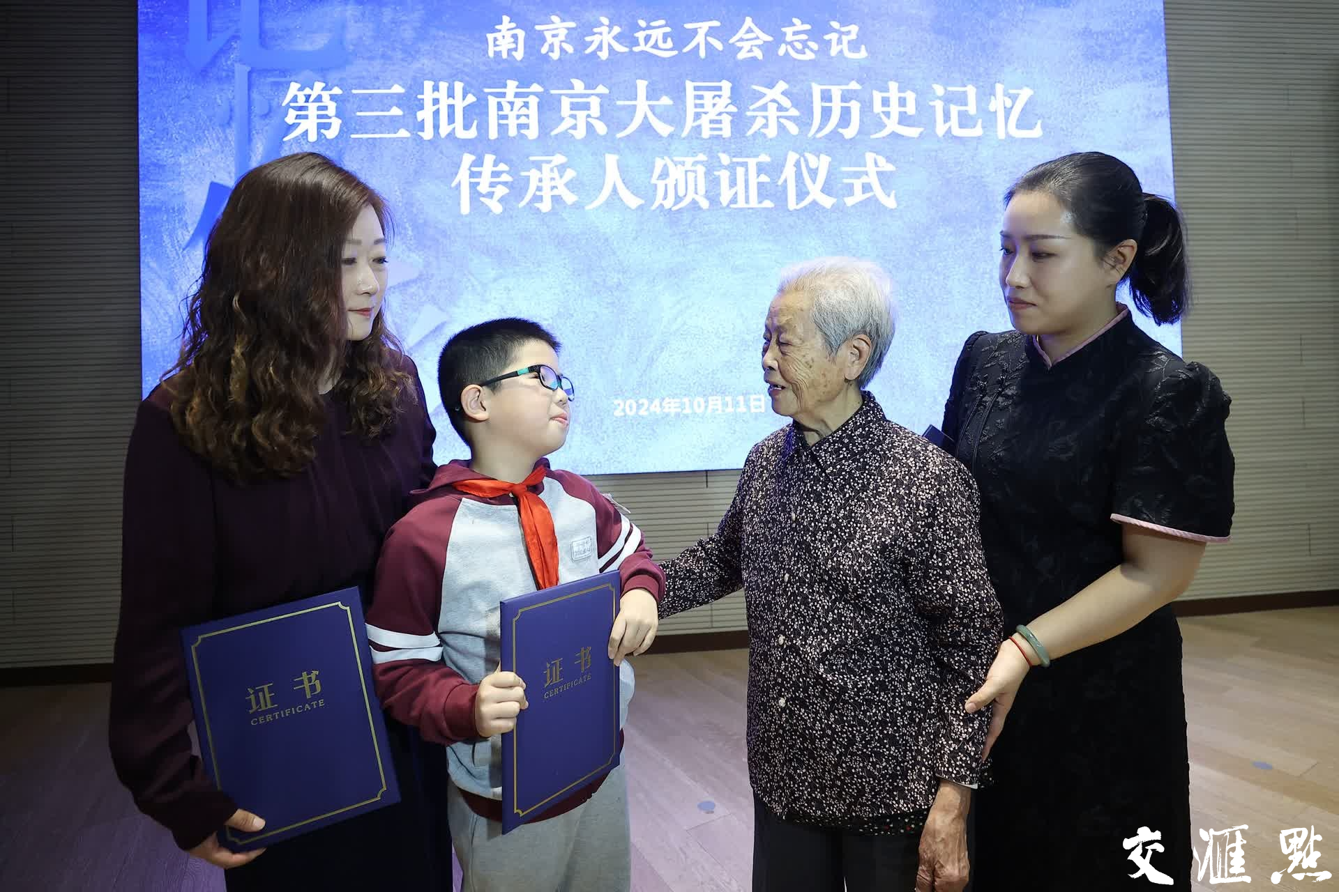 今年10月,侵华日军南京大屠杀遇难同胞纪念馆为两位百岁幸存者薛玉娟和王义隆举办了寿宴。如今,百岁南京大屠杀幸存者仅剩5位。他们既是南京大屠杀历史的活证人,更是中国人民抗日战争胜利的见证者。随着岁月流逝,历史见证者们正逐渐老去,而后代们正成为传承历史记忆的主力军。在南京市琅琊路小学雨花分校,已故幸存者刘贵祥的外孙女、南京大屠杀历史记忆传承人胡静雅是一名美术教师,她正计划向学生讲述外公的故事,引导学生通过画笔表达对历史的思考与和平的祈愿。蒋秉錞也将继续拜访更多幸存者和后代,“希望能够了解更多的故事,让每一个小故事合成一个大故事”。