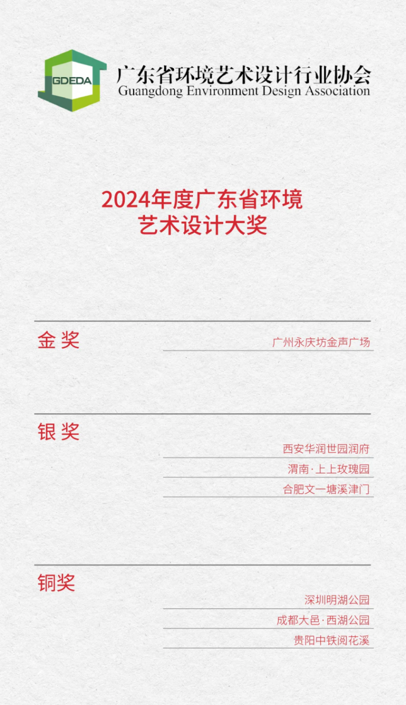 在备受关注的颁奖环节,山水比德凭借多元场景下的优质设计实践收获多项荣誉:广州永庆坊金声广场荣获金奖,西安华润世园润府、渭南・上上玫瑰园、合肥文一塘溪津门荣获银奖,深圳明湖公园、成都大邑・西湖公园、贵阳中铁阅花溪荣获铜奖。