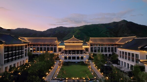 "聚焦"策略,则意味着在细分场景中做精做深,在小池塘里做成大鱼。换言之,就是星级饭店要在自己擅长的领域构筑护城河,形成难以复制的体验优势。延续君澜"将中国文化转化为可体验场景"的能力,台州君澜•飞龙山庄聚焦于"宋式美学"这一细分赛道,将君澜"让酒店空间成为国人有趣的休闲生活载体"的理念具象化。酒店整体规划汲取山水意境,融合传统宫苑轴线与江南园林布局。白天,层叠的楼宇在烟波绿意中若隐若现,仿佛一幅美丽的山水画卷;入夜,画檐灯火闪烁,尽诉宋时的风雅韵味,让人仿佛穿越回了千年前的繁华盛世。入户至大堂,视野景观层层递进,从可见山水花木错落其间的江南园景门,到回廊转折间岁月温润、文化交融,再到翻簧竹雕、海门台绣等地方古法技艺嵌入各个角落,宾客如步入一幅雅集百锦图。同时围绕宋时"点茶焚香、挂画插花"的四般闲事,将千年雅趣融入度假体验,让宾客在山水相和的桃源深处,用文化氛围填补浮生半日之闲。