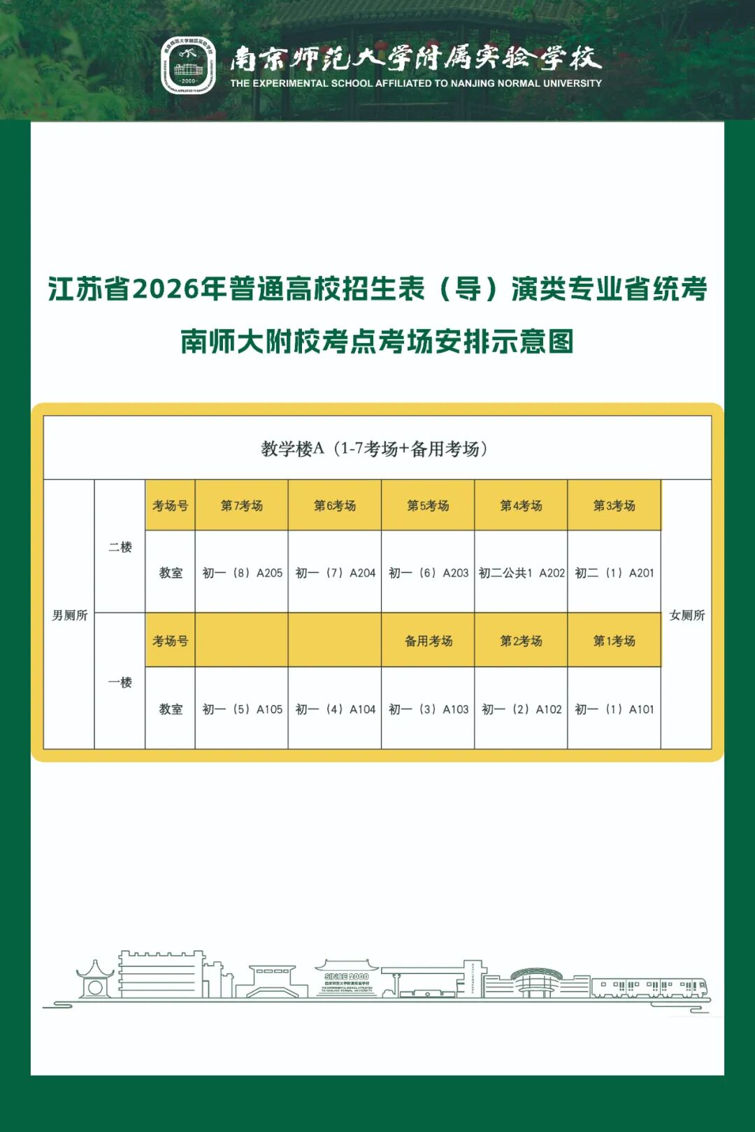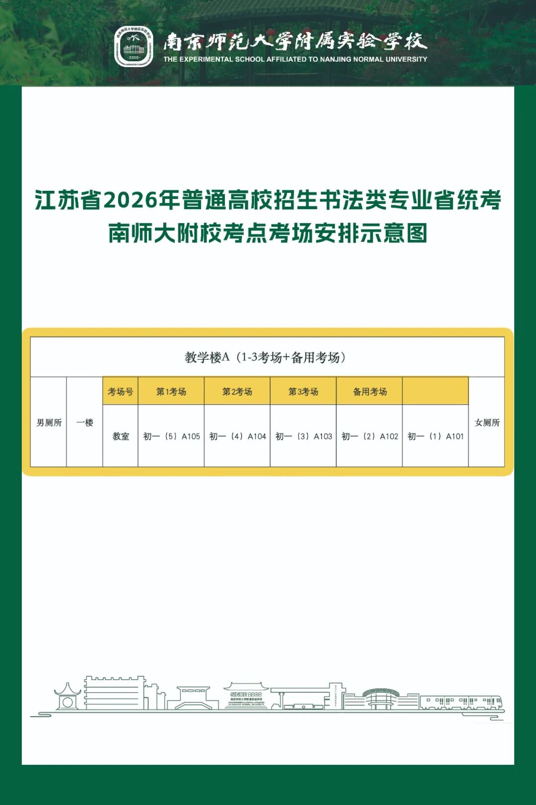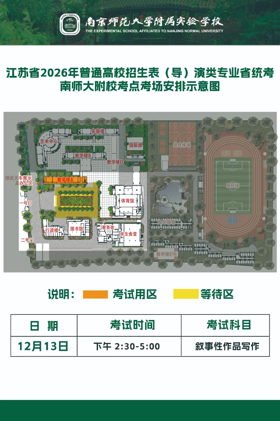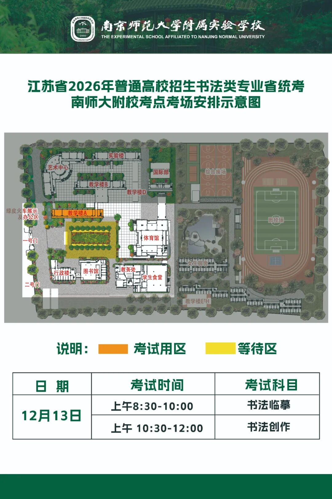 交汇点讯 记者从南京市招考院获悉,2026年江苏省普通高校招生书法类专业省统考和表(导)演类专业省统考将于12月13日举行。南京市的考点设在南京师范大学附属实验学校(南京市栖霞区学衡路28号)。