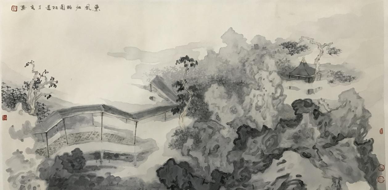 “苏州园林与北京的园林不同,极少使用彩绘。梁和柱子以及门窗栏杆大多漆广漆,那是不刺眼的颜色。墙壁白色。有些室内墙壁下半截铺水磨方砖,淡灰色和白色对衬。屋瓦和檐漏一律淡灰色。”这是对江南园林的准确描述。但于亨以此为题,不是照搬实录,也不是全景覆映,而是以总体感受主观认识为主,布局结构全由心生,将园林主要元素高度提纯,以中国画的笔墨语言,点画、勾勒湖石、曲廊、小亭、树木等结构形态,并赋予画面一片冲淡清和、含蓄空灵的淋漓水气,为观者描述出一幅幅具象与抽象相结合,工笔与写意相配搭的极具个性意味的园林景象。这种通过对园林元素的解读和理解,其最为大胆的表现就是“拆掉”了园林的墙围,将过去附属于个人私密性的空间完全洞开,使园林属性得以回归自然,重新成为原始造化的一部分,在似与不似的幽眇意境中,走出一条传统笔墨语言革新创造的个性化道路,用全新的水墨理念,将千百年来一个定式化的园林,推演为一个开放的园林、脱胎换骨的园林,可以无限拓展并不断生长的园林!同时也让中国山水画的理性思维得到极大滋养,创作主题得到飞跃性拓展。