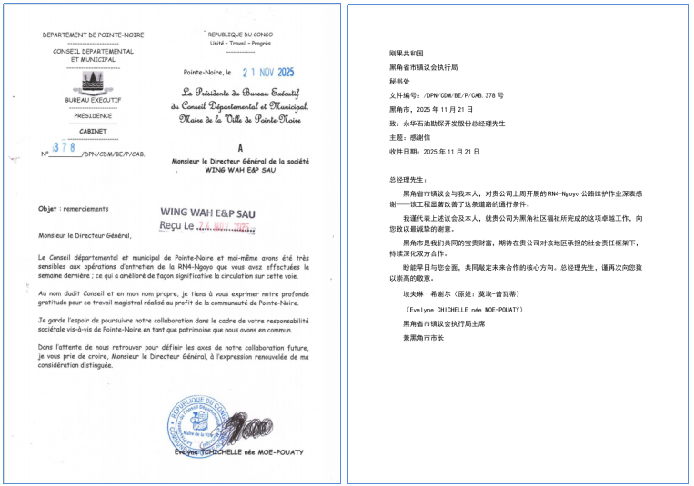 2025年11月21日,刚果共和国黑角省市镇议会执行局主席兼黑角市市长埃夫琳・希谢尔(Evelyne TCHICHELLE née MOE-POUATY)女士亲笔致信南方石化集团刚果永华公司,对永华公司出资高质量完成4号国道恩戈尤段维修保护工程致以最诚挚的谢意。市长在信中高度赞扬该维保工程“显著改善了道路通行条件”,并充分肯定南方石化集团刚果永华公司为黑角社区民生福祉所做出的积极贡献。