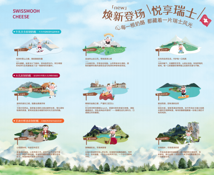 3.瑞士文化插画故事化:每款产品包装融入9个原创“萌牛探索”插画场景,从阿尔卑斯雪山到卢塞恩湖畔,让奶酪成为孩子认识世界的媒介窗口。