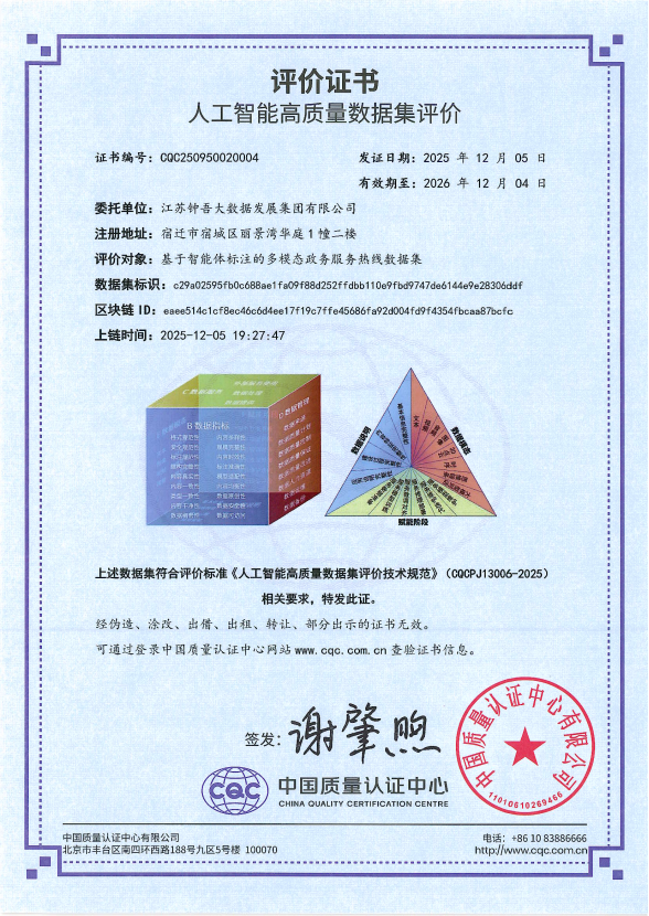 新华日报财经讯 近日,中国质量认证中心(CQC)向江苏宿迁市颁发了全国首张政务领域“AI-Ready”(AI就绪度)高质量数据集评价证书,标志着该市在人工智能数据要素建设与应用方面取得突破性进展。此次认证的数据集由江苏钟吾大数据发展集团有限公司自主构建,为政务热线智能化提供了核心数据支撑。