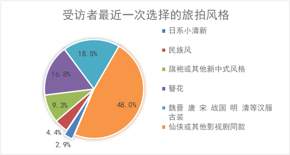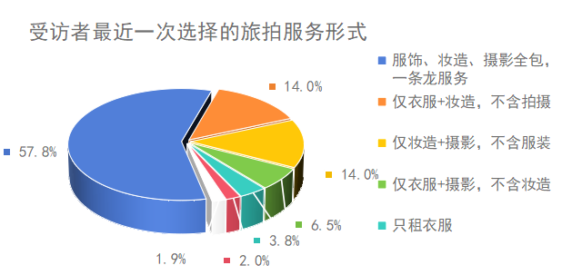 从最近一次选择的旅拍形式和拍摄风格来看,半数以上消费者选择“服装、妆造、摄影全包,一条龙服务”,最受消费者欢迎的拍摄风格是仙侠或其他影视剧同款、汉服古装、簪花和旗袍新中式。